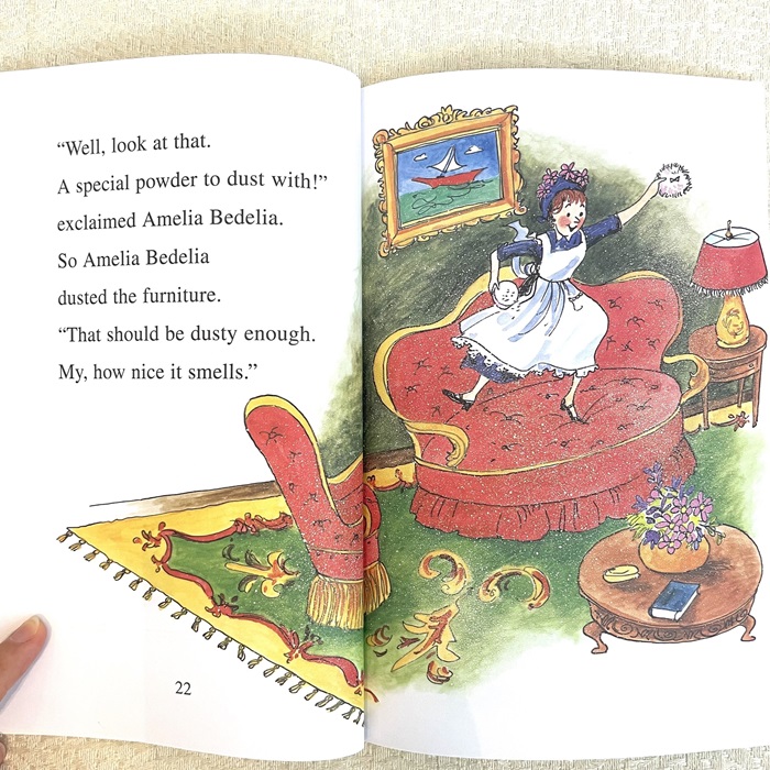 Amelia Bedelia看到了Roger太太的Dusting power粉撲,她把這特殊的Dust灑到了全部的家具上