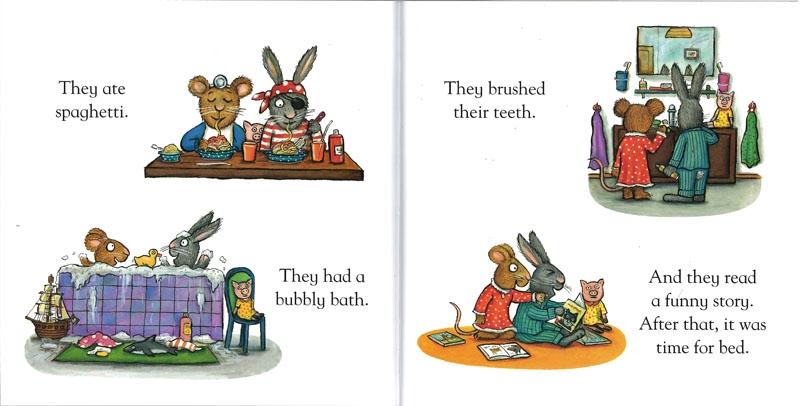 When Posy goes to stay at Pip’s house they have lots of fun together before bedtime. But just as they switch out the light, disaster strikes: Posy realises that she has forgotten her favourite frog toy. Desperate to help his distraught friend, Pip offers Posy a range of different toys to substitute for her frog, including his own favourite frog money box. But none of them will do, “that’s the wrong frog!” Posy wails. It is only when Pip gives Posy his own, very favourite, pig toy that Posy is comforted and that the friends can get a good night’s sleep, at last.