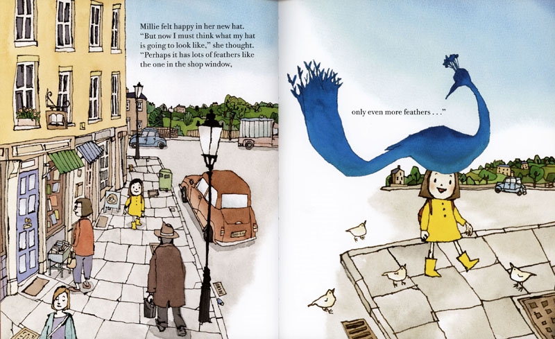 Millie loves hats, but she has no money and she can't afford to buy any of the lovely hats in town. But the man in the hat shop has an idea. He produces a box containing a hat too fine and beautiful to behold, but with the most perfect shape and colour imaginable, if Millie dares to imagine it. Millie does dare, and soon she can not only see her own beautiful hat, but everyone else's hats as well.