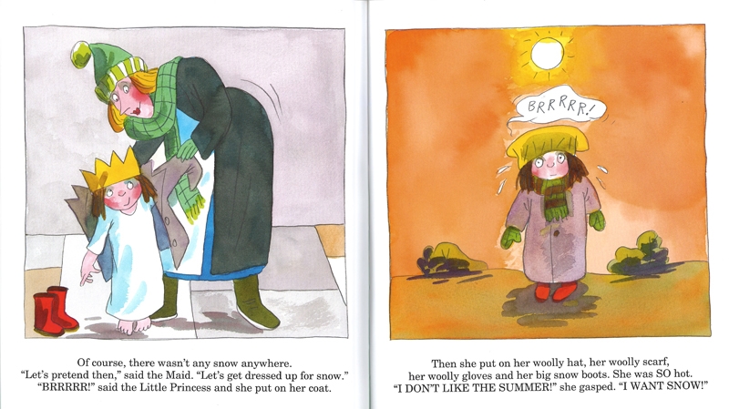 When the Queen goes on a trip and sends back a photo of her feeding some penguins, Little Princess decides she wants snow too. The whole palace tries all kind of things - from sandmen instead of snowmen to mudballs instead of snowballs. But this little royal won't be satisfied until she gets what she wants... and sometimes not even then!