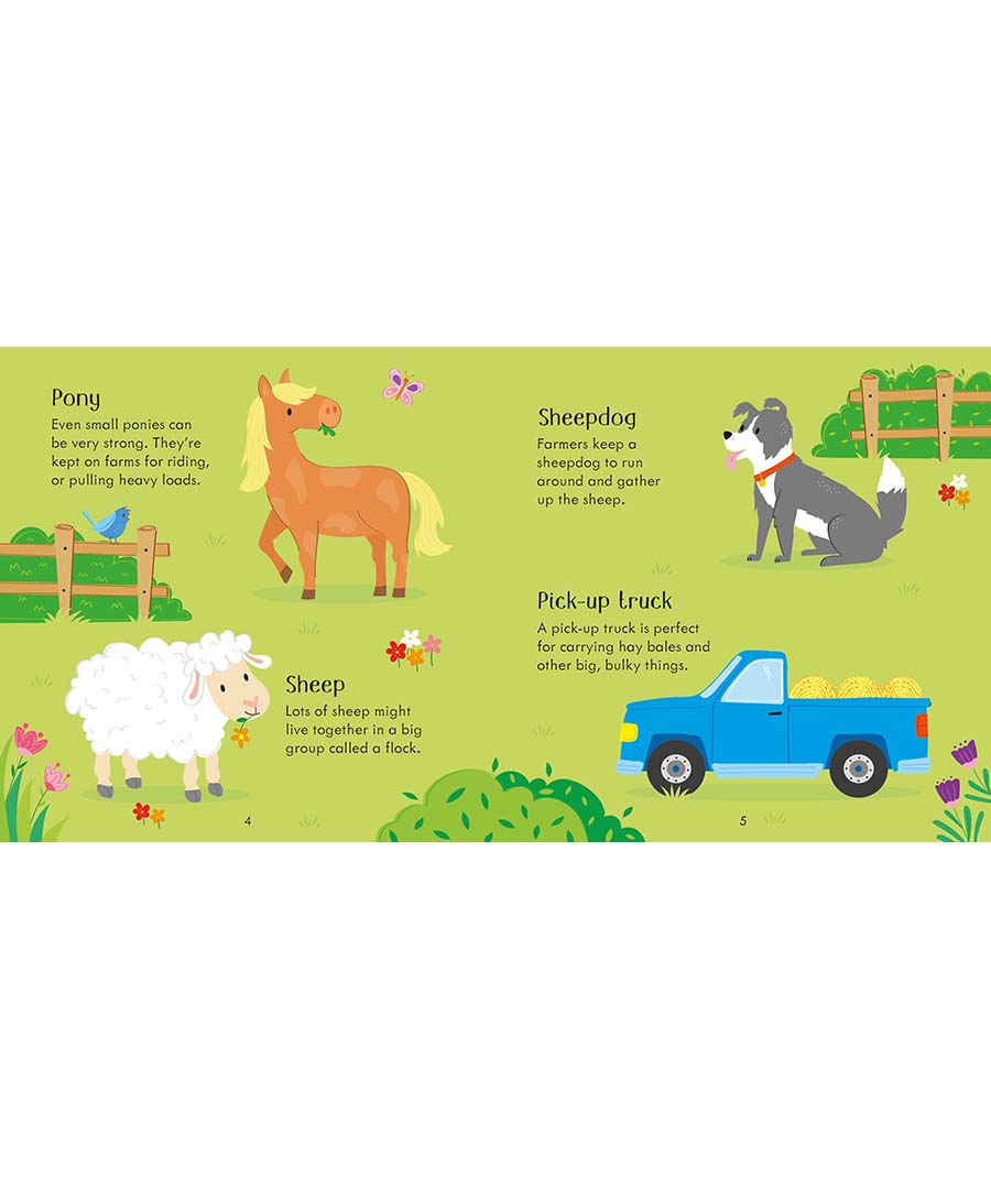 The box contains 4 bingo boards, 36 picture cards and a book, which has instructions for two different memory games as well as a fascinating fact about each of the farm animals and vehicles that appear on the cards.