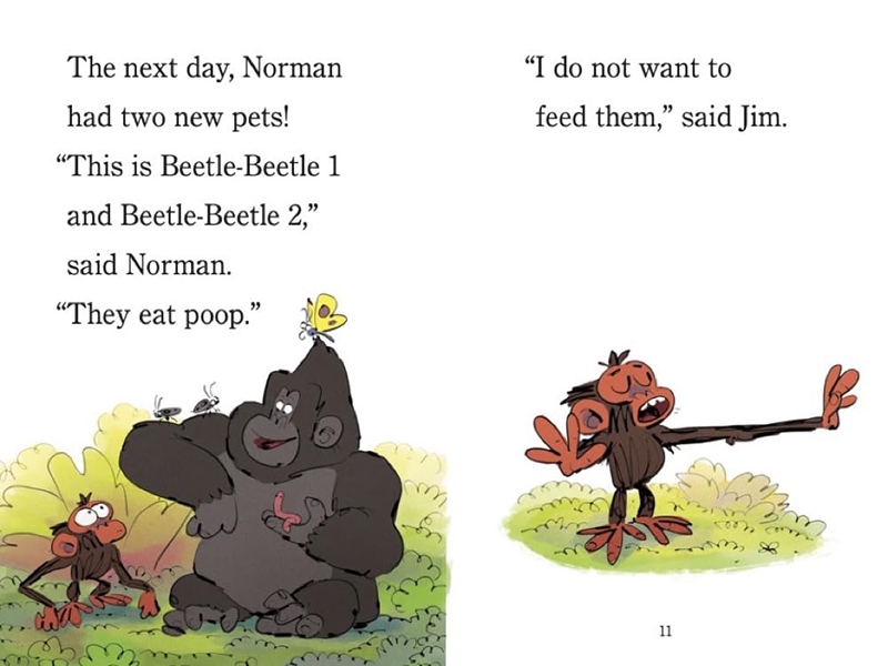 When Norman shows Jim his pet butterfly, Butterfly-Butterfly, Jim is suitably impressed, especially when Norman spouts butterfly facts. Then Norman adds Beetle-Beetle 1 and Beetle-Beetle 2 and so many more to his menagerie. Now Norman spends all his time feeding and caring for his pets and doesn’t have time to play. Grumpy Monkey Jim feels left out. And when all the bugs have babies, Jim declares that Norman has too many and persuades his friend to set them free. But then Norman sees a ladybug…