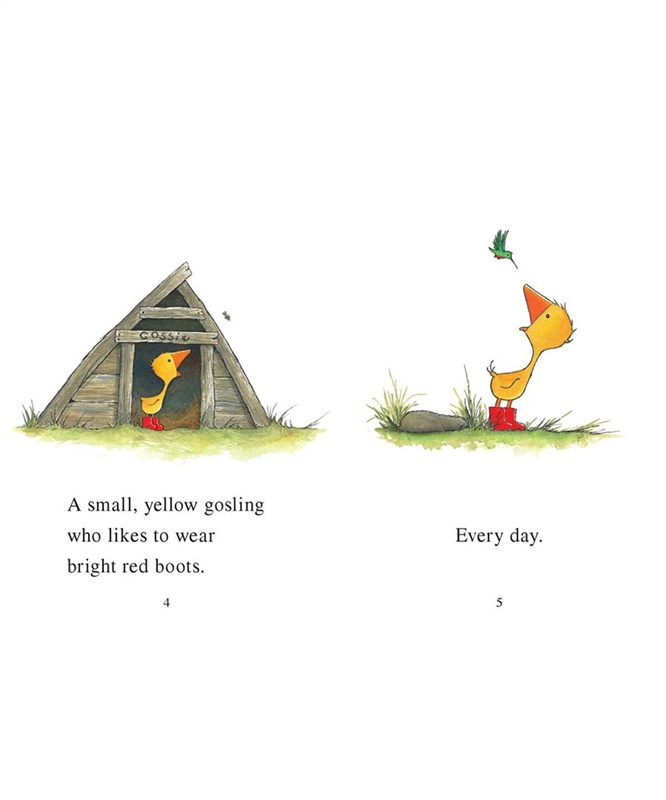 Gossie is a small yellow gosling who loves to wear bright red boots—every day. But one morning she can't find them!