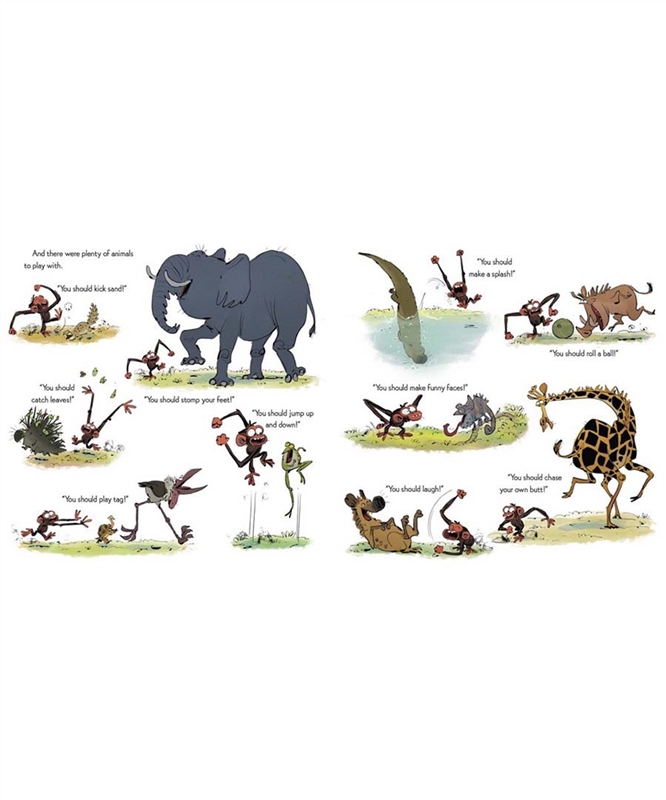 Instead, Jim Panzee spends time swinging with the monkeys, singing with the birds, and rolling around with the zebras. When his friends return home, Jim finds new animal friends so he can keep on playing. But by the end of the day, when Jim is dirty, itchy, and hungry, his best pal Norman patiently tells him “Too much of anything can be, well, too much.”