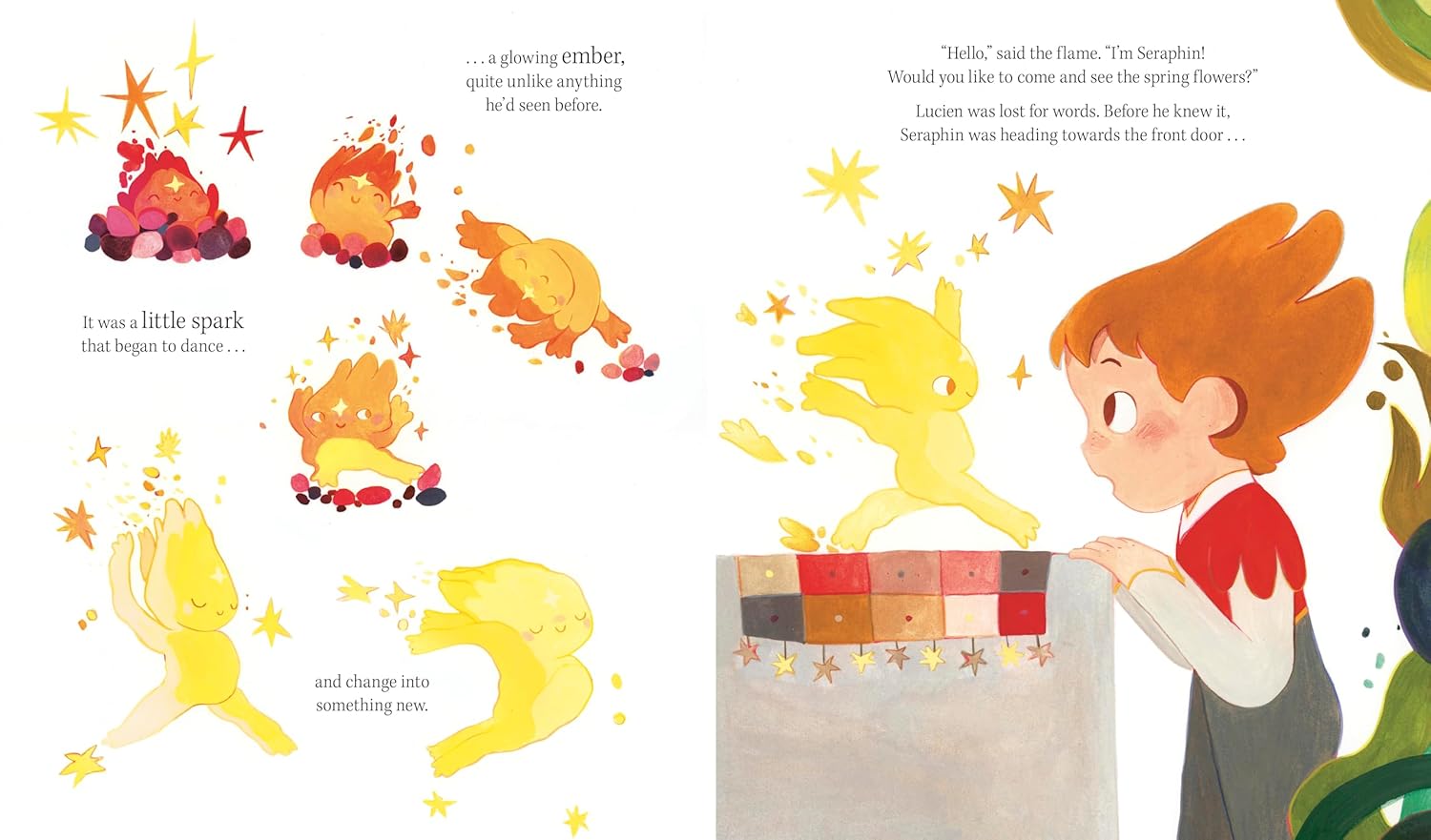 Lucien has always been wary of change – whether it’s trying new foods, moving to a new home, or making new friends. He prefers the comfort of the familiar. But one stormy night, a gust of wind blows open his window and extinguishes his fire, leaving only a single ember still glowing. To his amazement, the ember transforms into a playful, dancing flame – a glowing boy who whisks him away on an extraordinary journey through all four seasons in a single day.