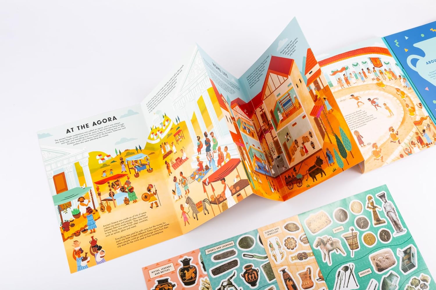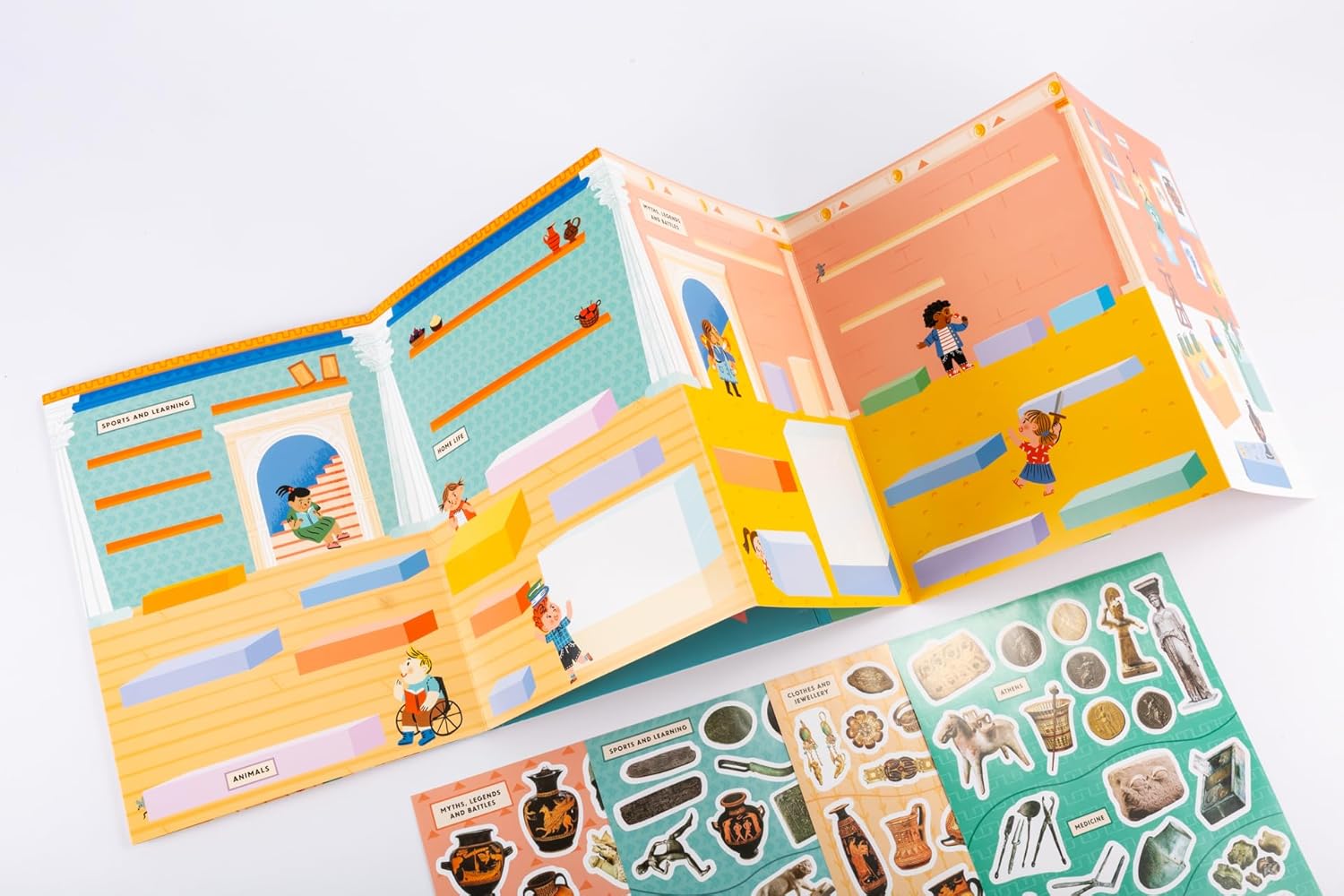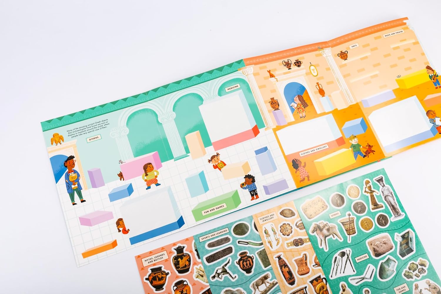 Fold-out the illustrated scenes and explore four different areas of ancient Greek history, from life at home to the Olympic Games. Then use real-life photographic object stickers to curate your own multi-room museum, filled with all sorts of amazing artefacts.