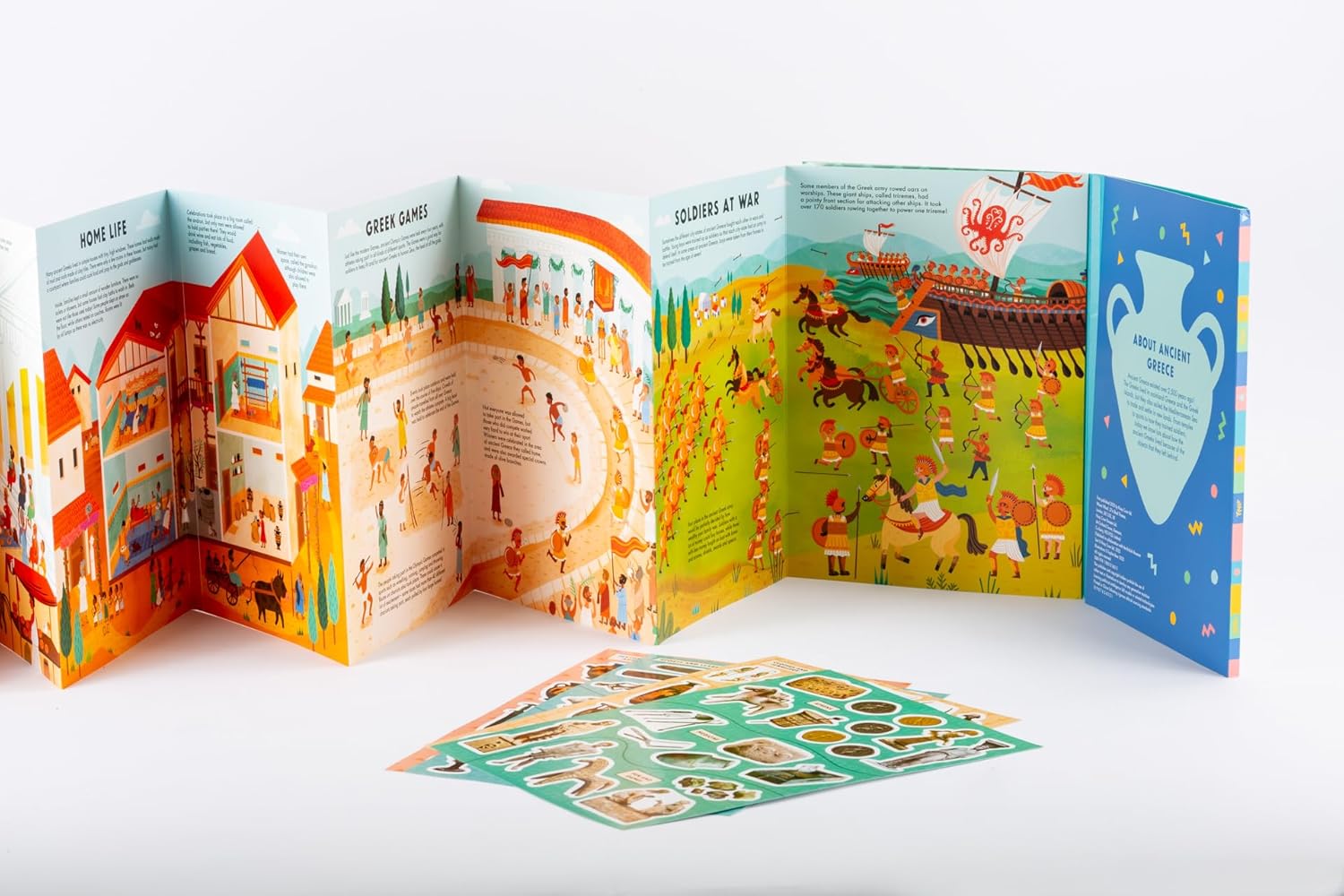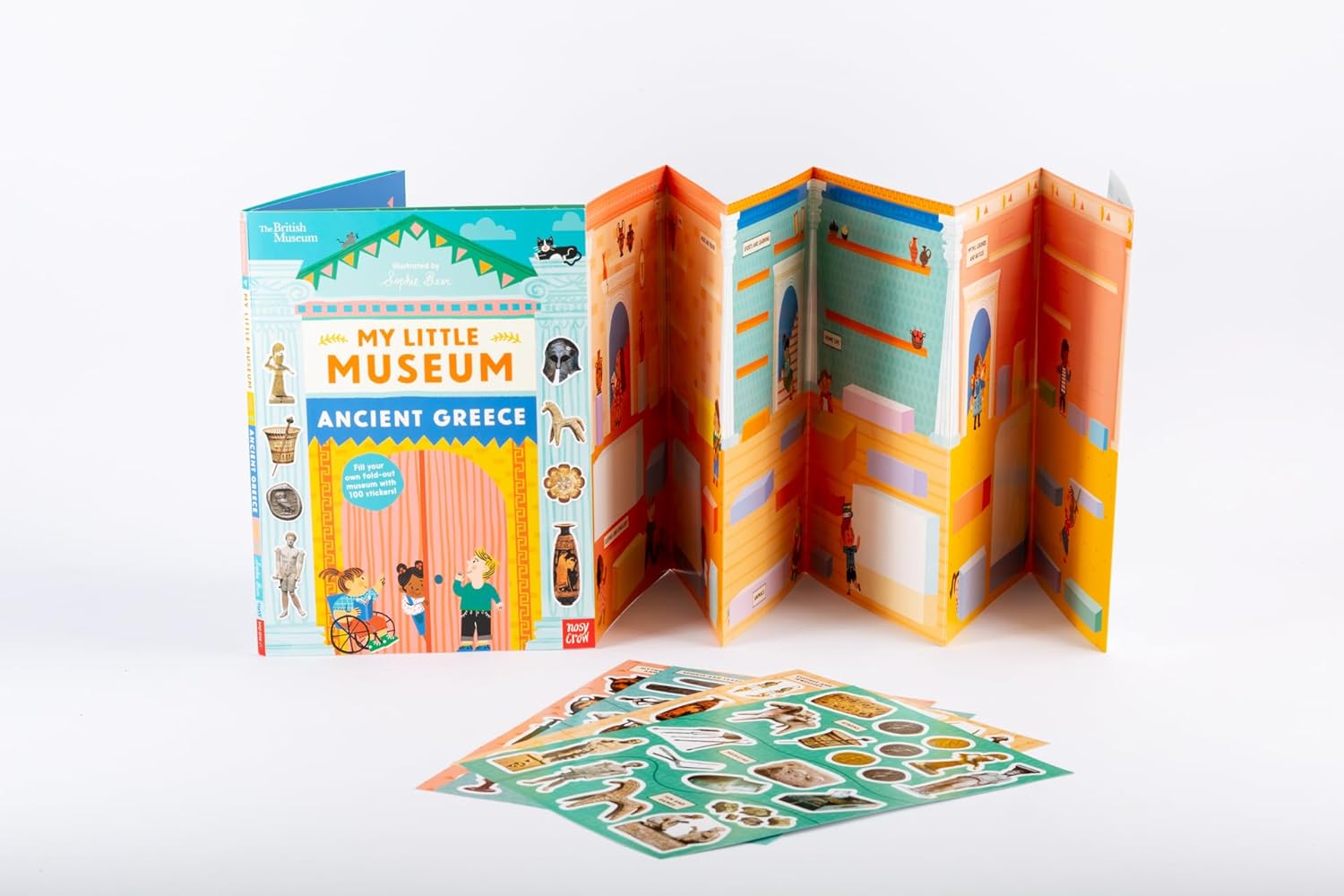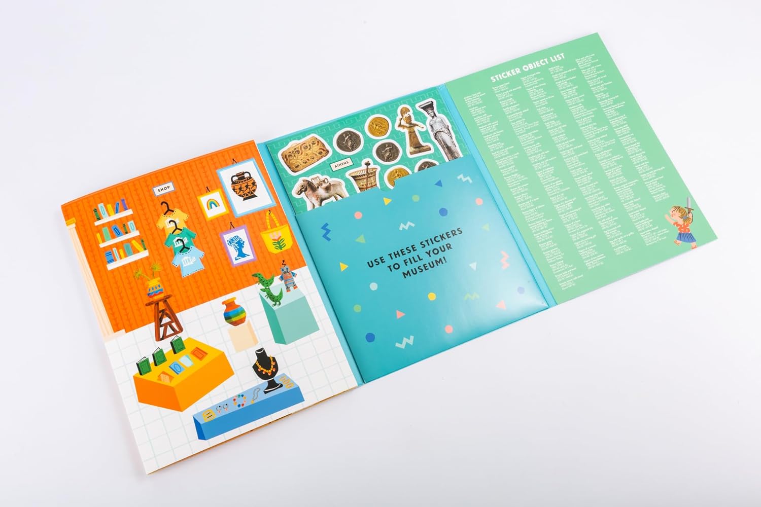 Fold-out the illustrated scenes and explore four different areas of ancient Greek history, from life at home to the Olympic Games. Then use real-life photographic object stickers to curate your own multi-room museum, filled with all sorts of amazing artefacts.