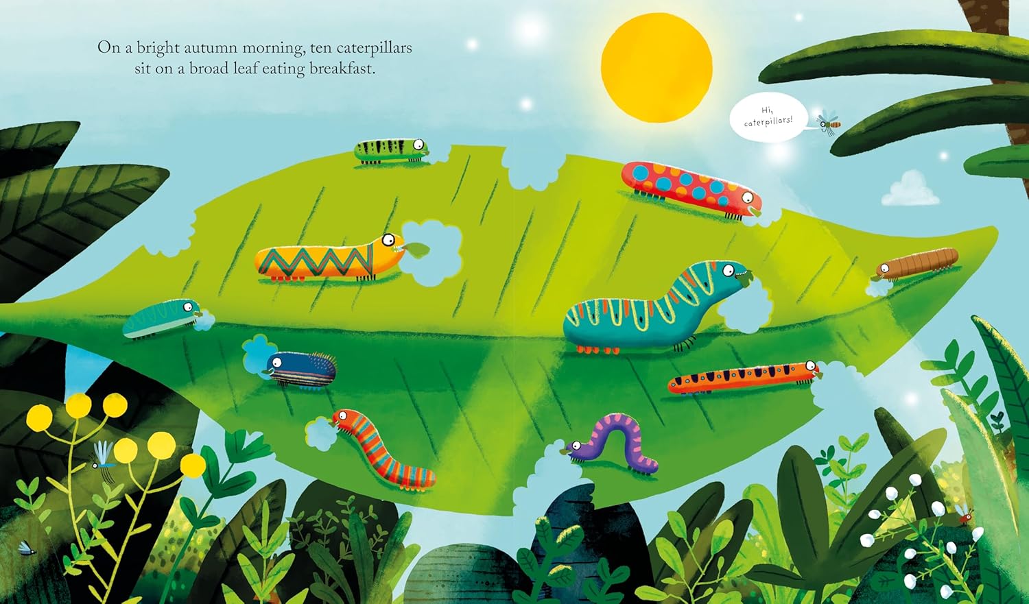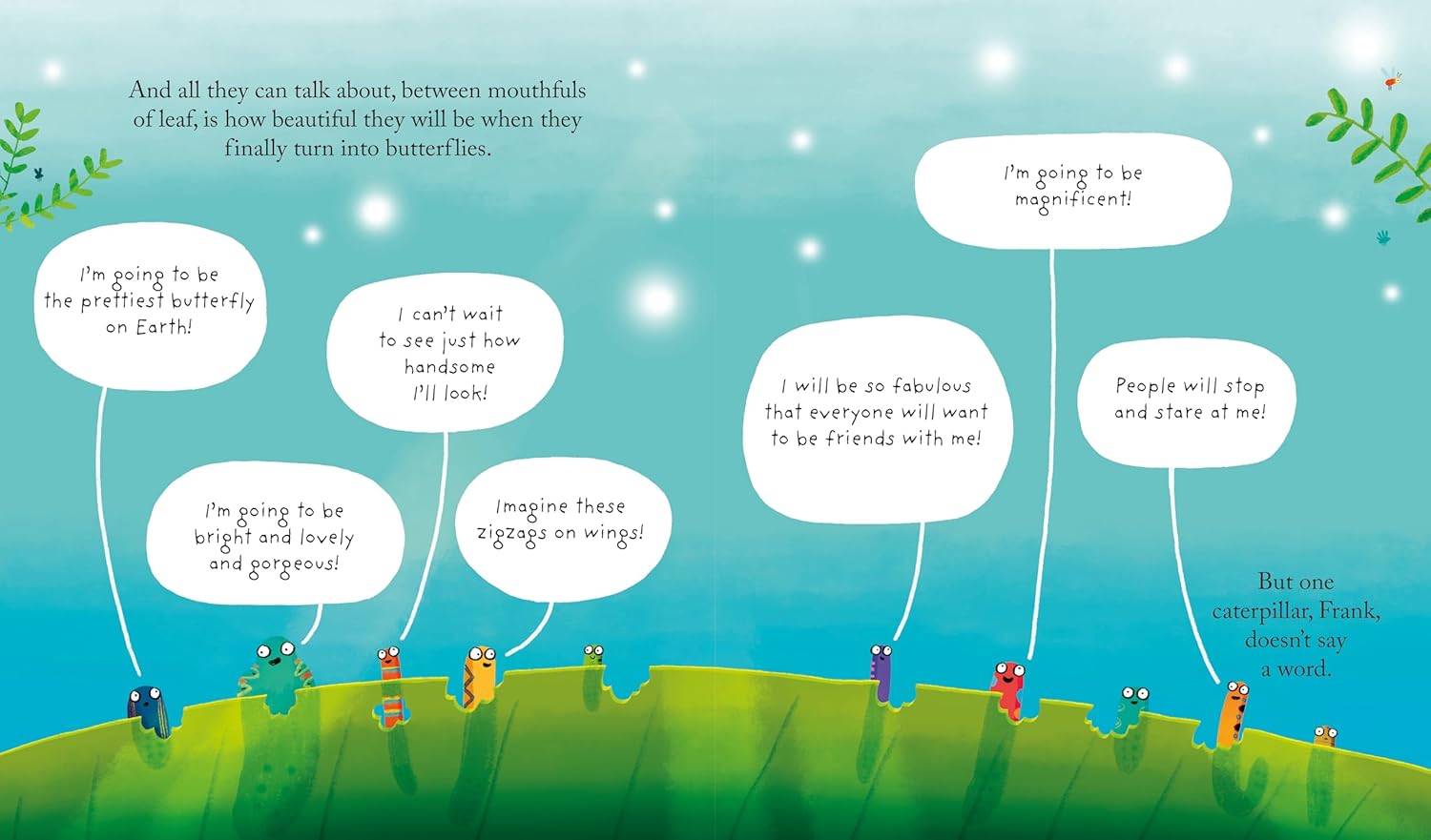 On a broad green leaf sit ten rather gorgeous (though they do say so themselves) caterpillars. And all they can talk about is what beautiful butterflies they are going to be! But not Frank.