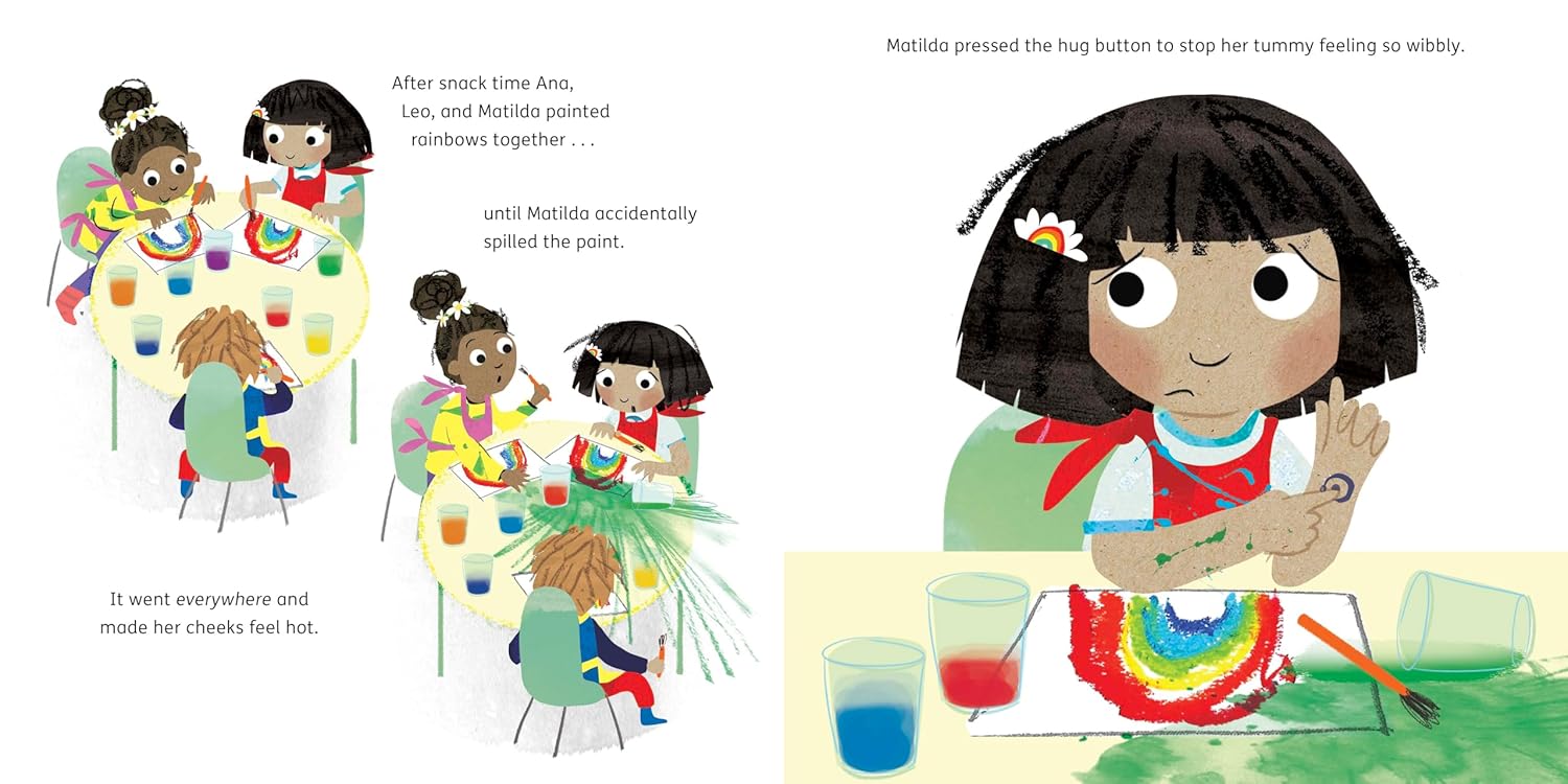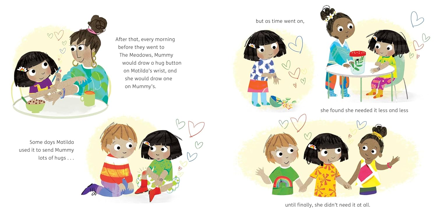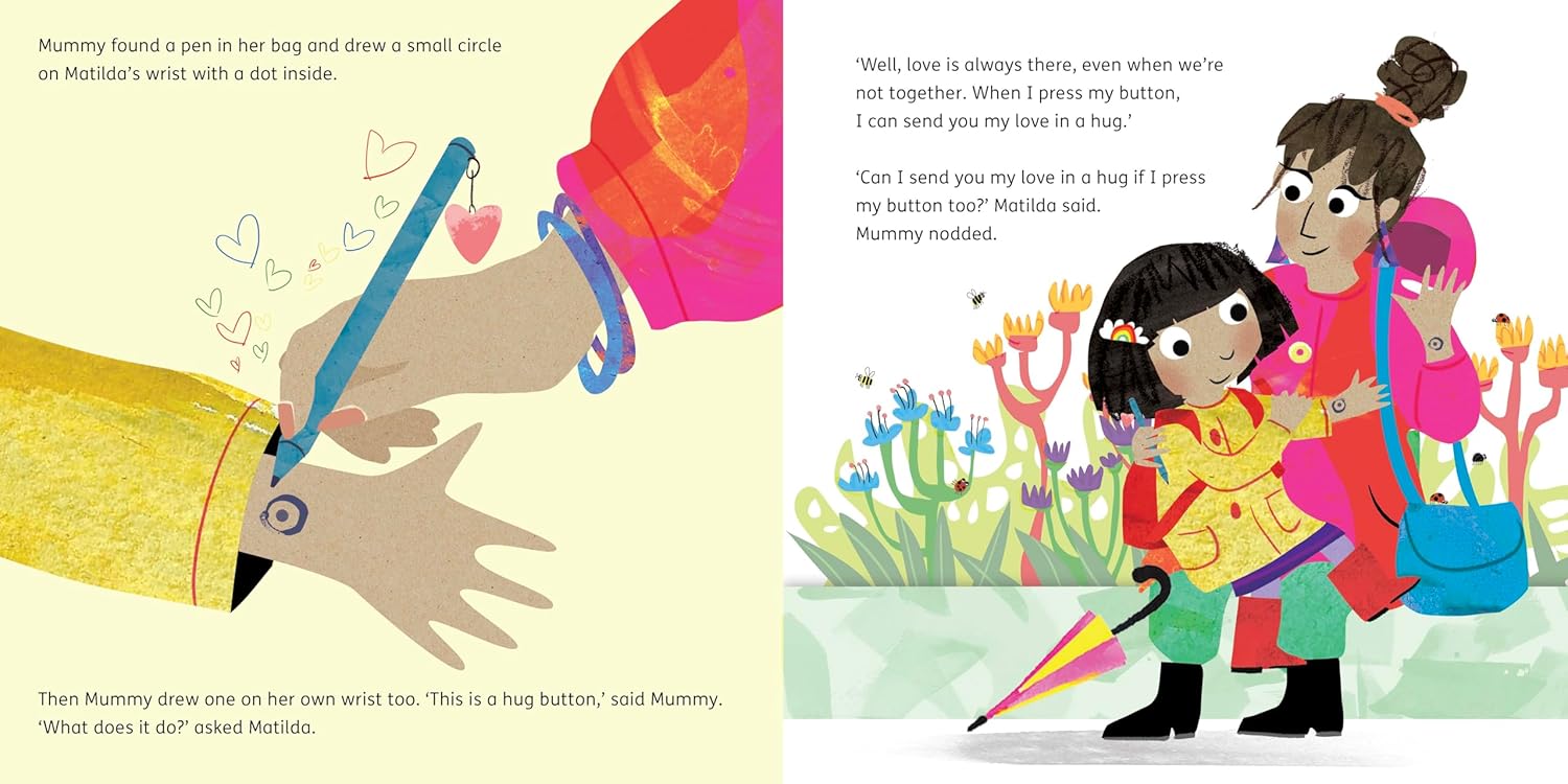 She doesn't want Mummy to go. The next day, Mummy has a helpful suggestion. She draws two hug buttons-one on Matilda's wrist and one on her own.