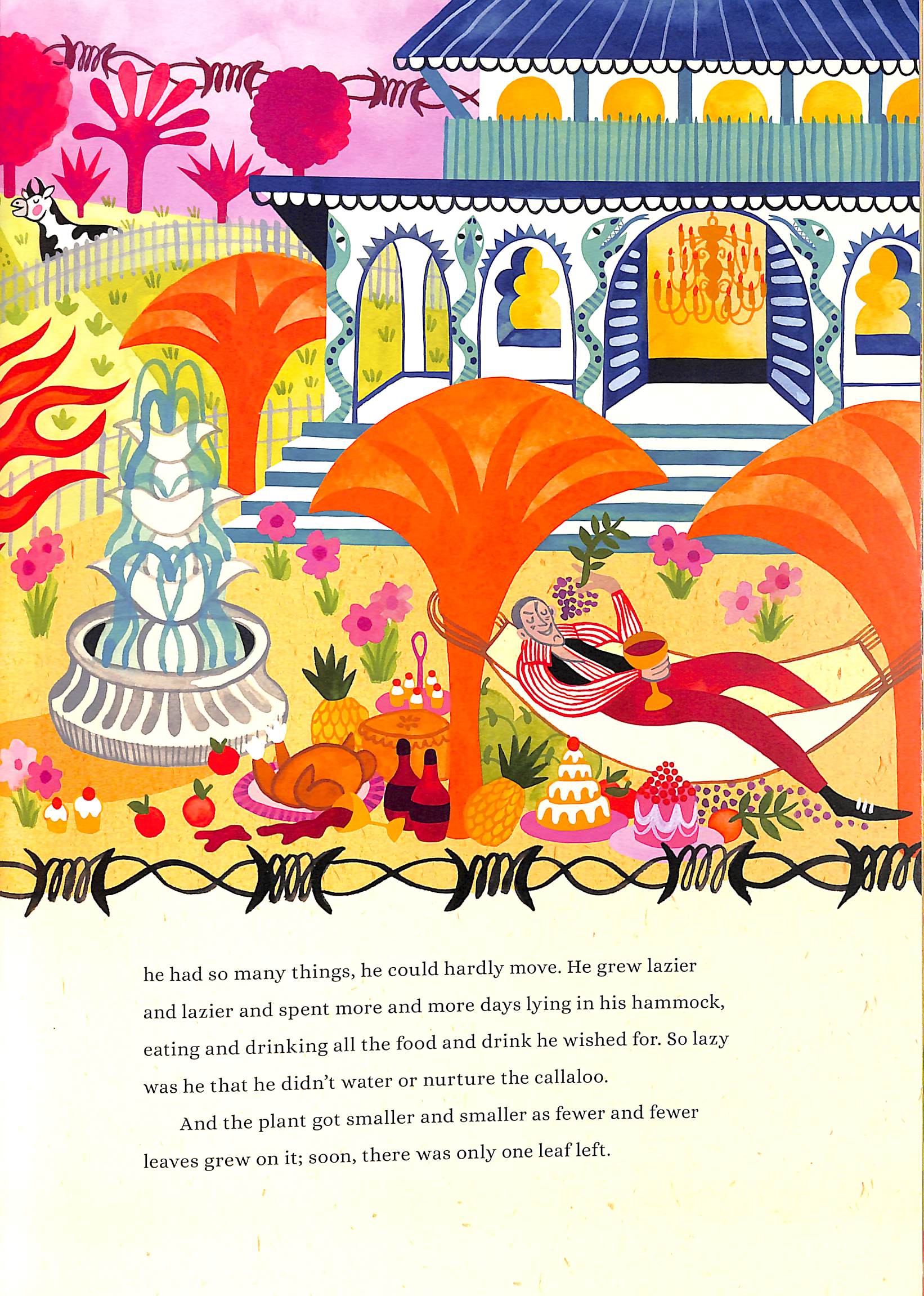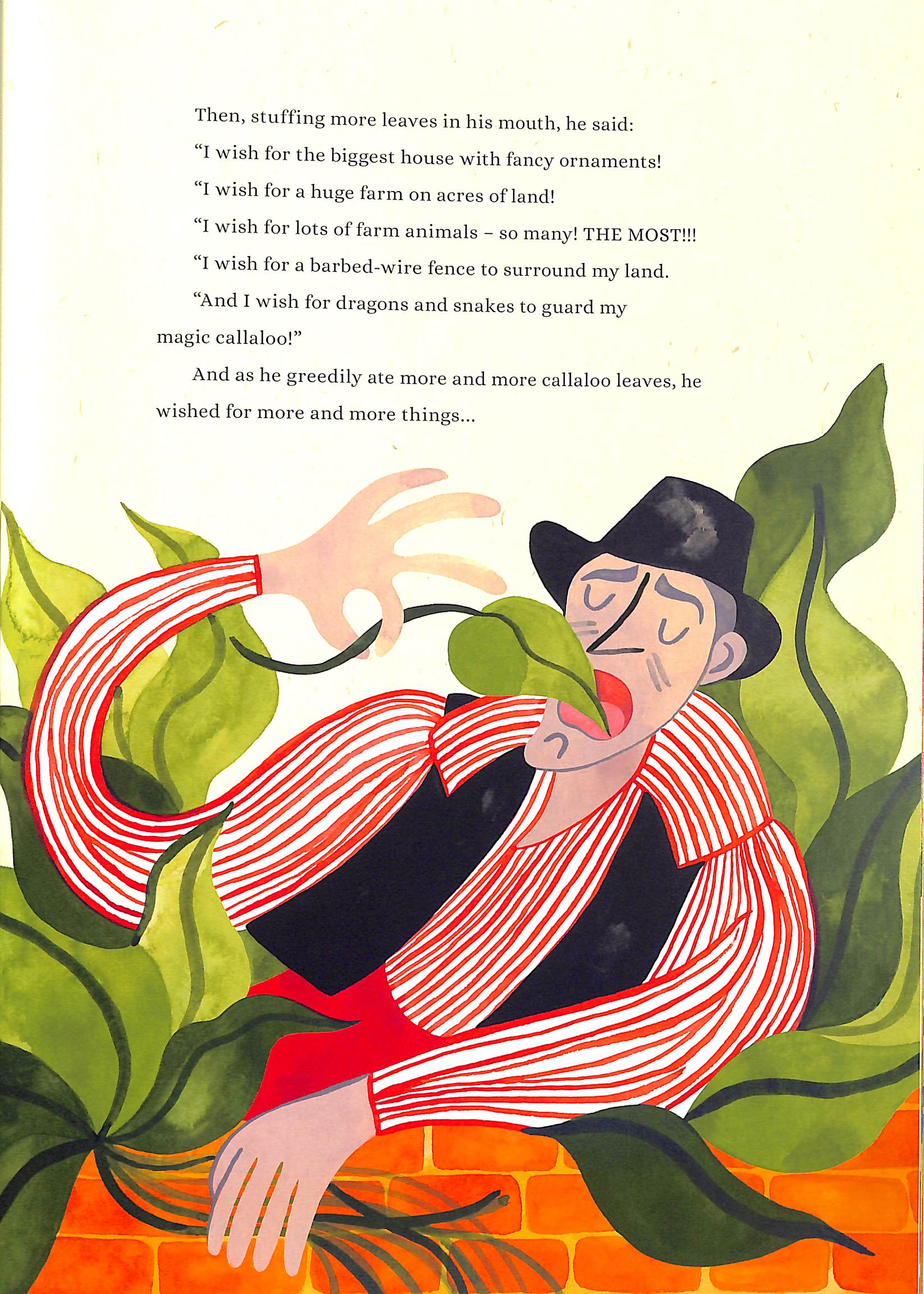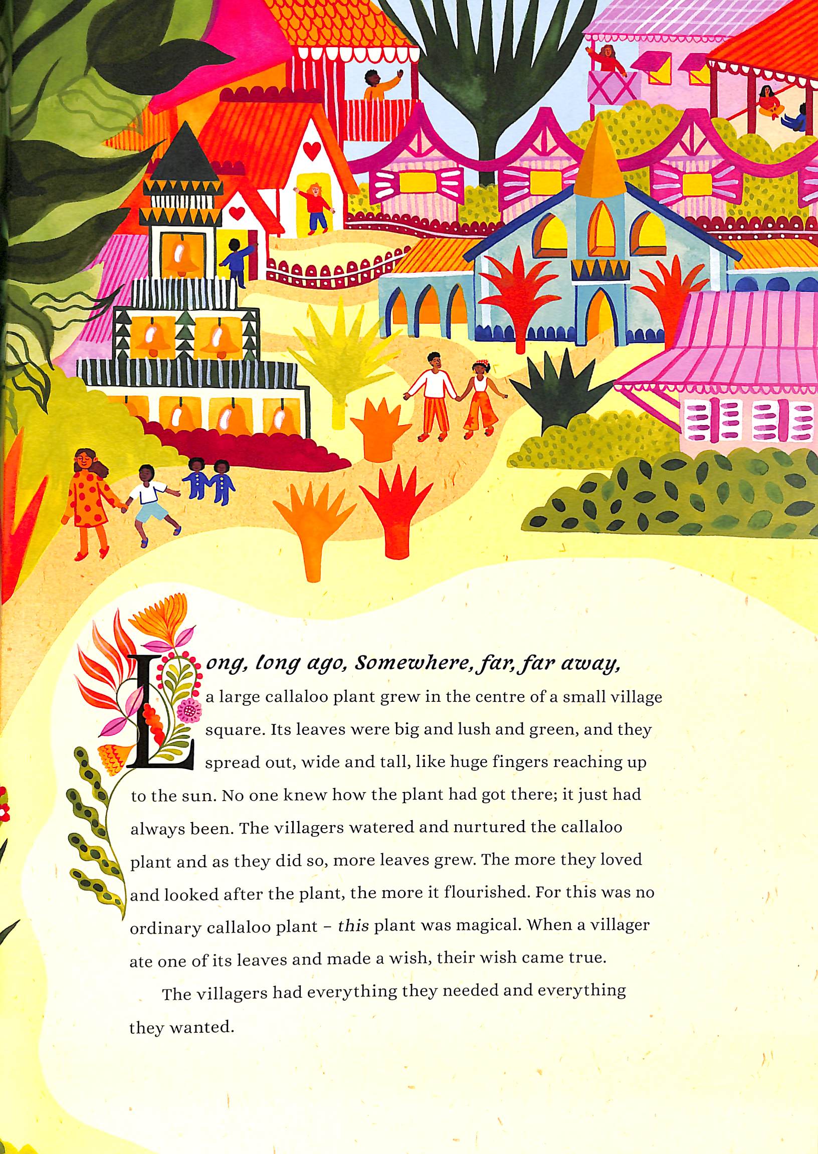 Long ago and far away, a magic callaloo plant grew in a village square. Whoever ate one of its leaves was granted a wish. But a greedy selfish man wanted all the wishes for himself so he stole the callaloo. With only one leaf left, Mister and Missus, desperate for a child, pluck it to make their dream come true. But the greedy man wants everything and he kidnaps their beloved daughter, who will ultimately make the most remarkable escape.