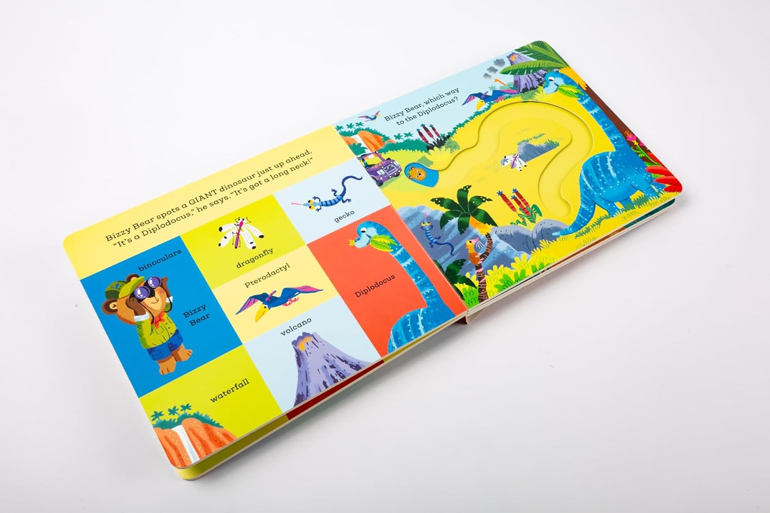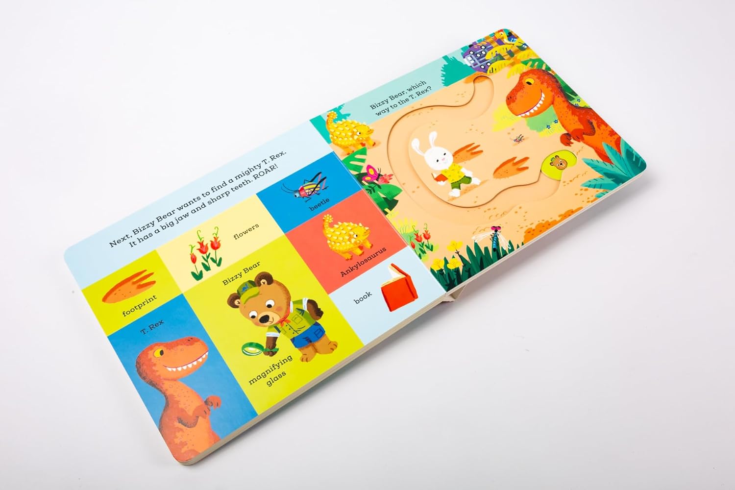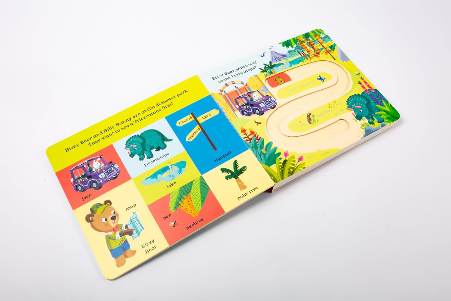 Bizzy Bear is searching for dinosaurs today, and he needs your help! Jump in the jeep and follow the dino tracks by pushing the sliding counters through the story to discover a Triceratops, Stegosaurus, T.Rex and more with the five easy-to-move counters.