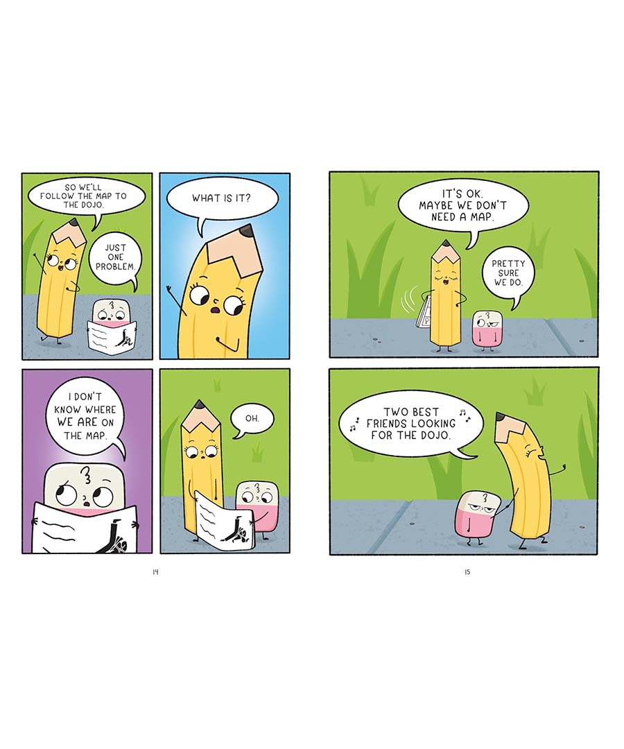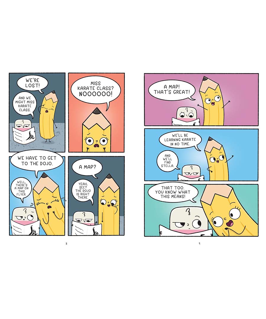 Pencil and Eraser are on their way to their first ever karate class—well, their person Stella is and they are tagging along. When Pencil gets a little too excited practicing her ninja moves, she falls right out of Stella’s backpack and lands on the sidewalk! And naturally, Eraser has no choice but to follow her.