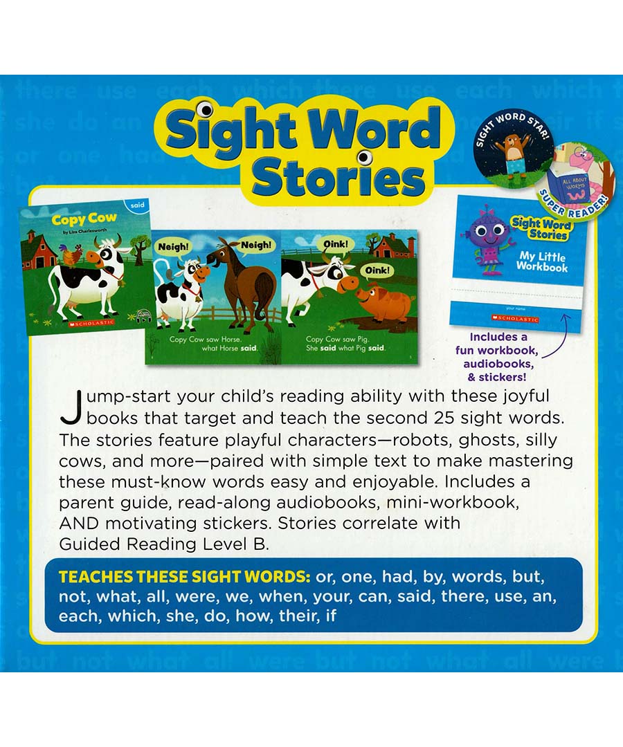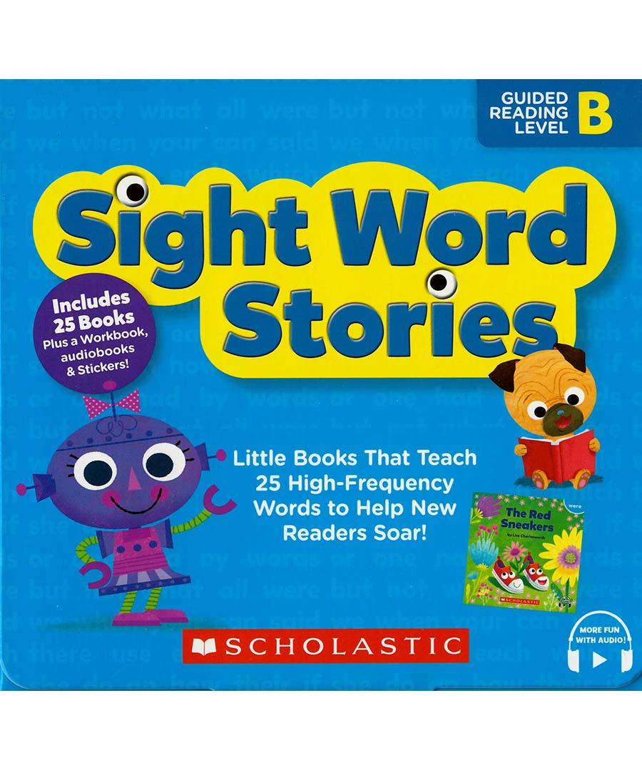 This bright red box contains 25 little books that each teach a must-know sight word via a playful, easy-to-read story. Characters include pugs, bugs, monsters, talking boots, silly superheroes, and more to make learning extra enjoyable. Comes with a parent guide, mini-workbook, and motivating stickers. Books are correlate with Guided Reading Level B.