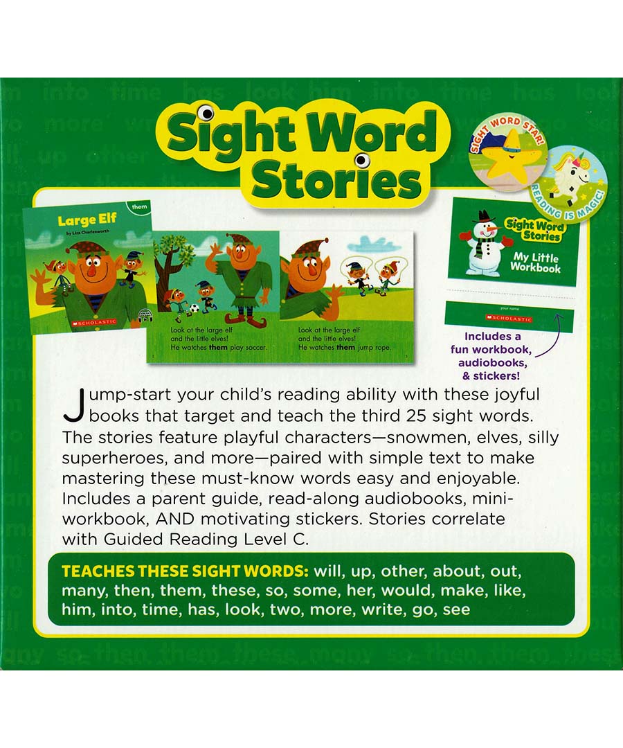 This bright red box contains 25 little books that each teach a must-know sight word via a playful, easy-to-read story. Characters include pugs, bugs, monsters, talking boots, silly superheroes, and more to make learning extra enjoyable. Comes with a parent guide, mini-workbook, and motivating stickers. Books are correlate with Guided Reading Level C.