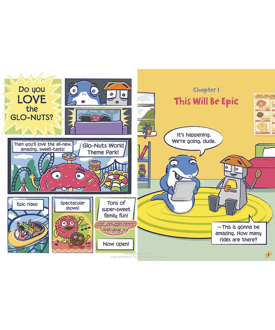 Shark and Bot are going to the GLO-NUTS WORLD theme park and they are pretty sure it’s going to be the BEST DAY EVER. They plan to: