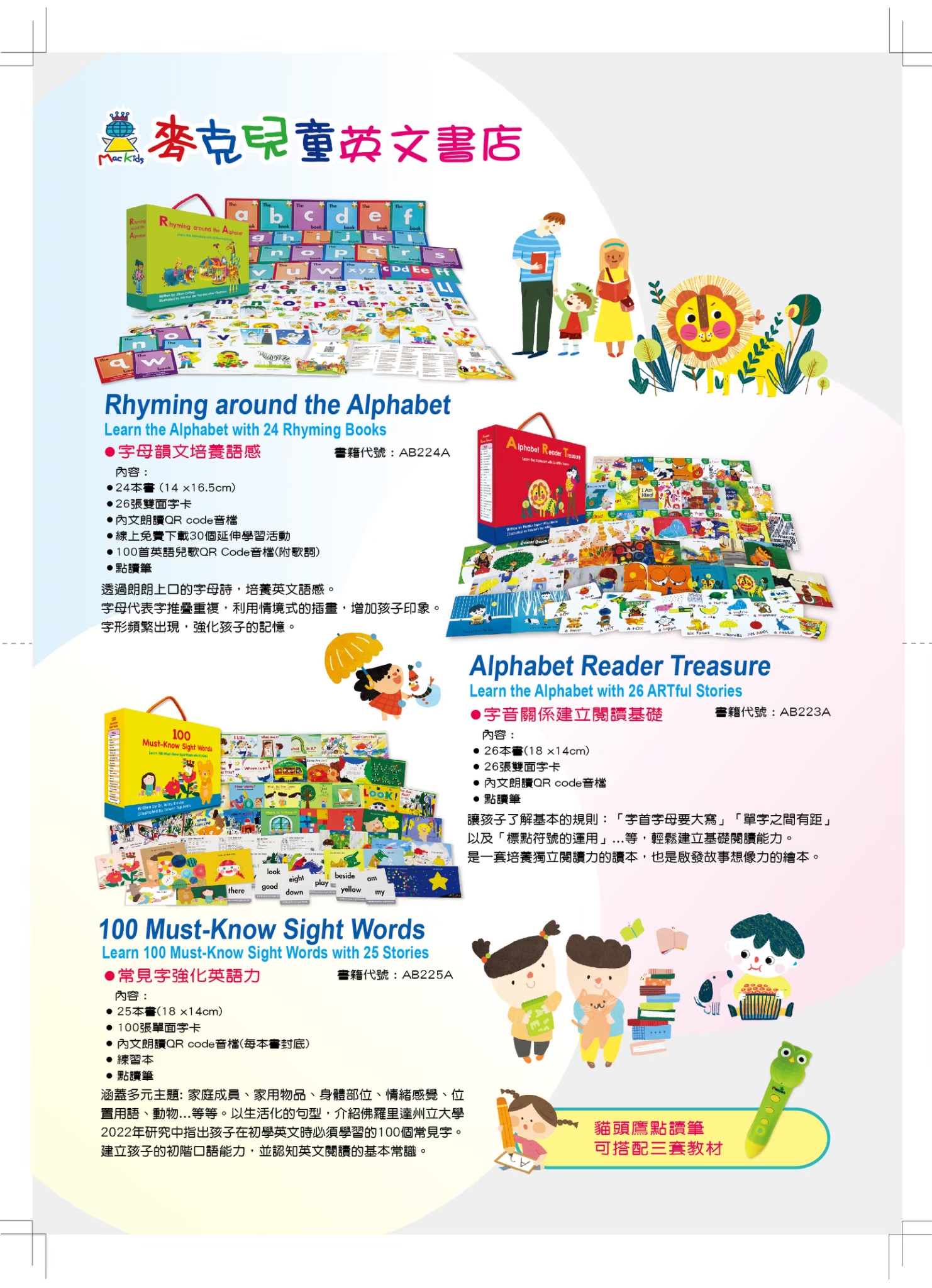 配合一再重複的句型及不同主題的單字,學生們可以在練習閱讀和生活化句型時,輕鬆學習100個常見單字,25本讀本內容包括了孩子們感興趣的主題:家庭成員、家用物品、身體部位、情緒感覺、位置用語、動物、等等。生活化的用字及句型,讓學生們可以輕鬆學習100個最基礎的常見字,建立