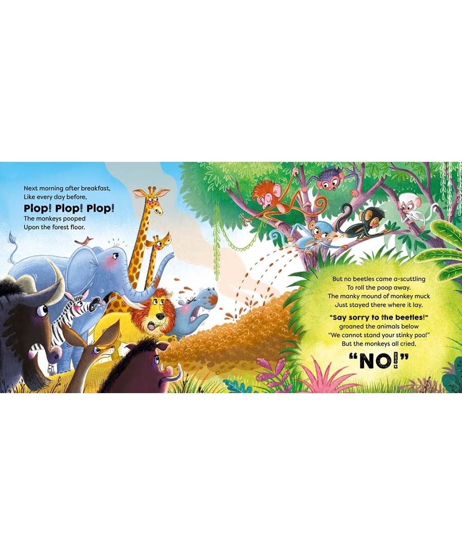 Dung beetles love to chew on other animals' tasty poo. But when the monkeys make fun of them for having such a stinky lunch, the beetles decide to munch elsewhere.