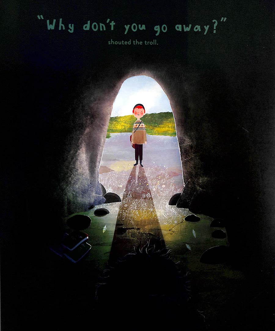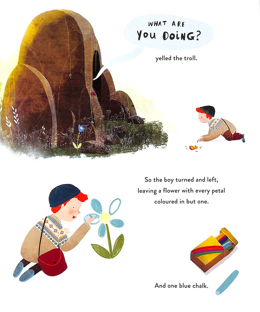 Everybody knew that a big fierce troll lived in the cave. Only one child cannot turn their back on the troll. One day, he draws a flower with every petal coloured in but one, and leaves the chalk outside the cave. The next day, the flower has been completed. Day-by-day, the boy and the troll finish each other's drawings, until they one shows a boy holding hands with a fierce, scary troll. "But you're not a troll," says the boy. "You're a boy - just like me." Patience, kindness and the power of art win out in the end: the two boys wordlessly draw together. Soon everyone joins in and forgets that there was ever a troll inside the cave.