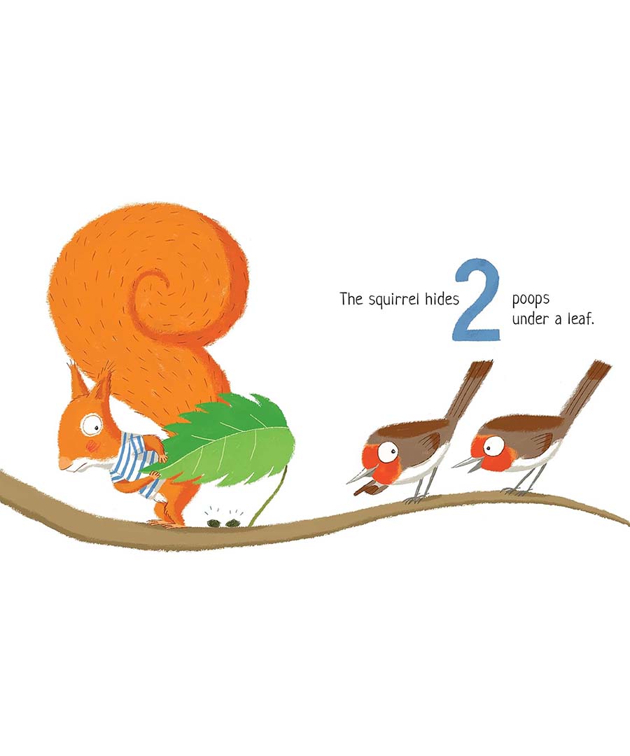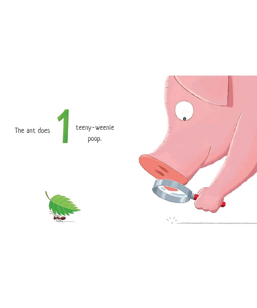 From 1 to 10, follow along as the animals discover how each of them poops, in this hilarious counting tale that is sure to have kids wanting to read it again and again. With oversized illustrations and playful humor, young children will be engaged to learn their numbers through funny situations involving animals, such as the pig that ends up with poop on its head or the cat that poops in the dog's bowl.