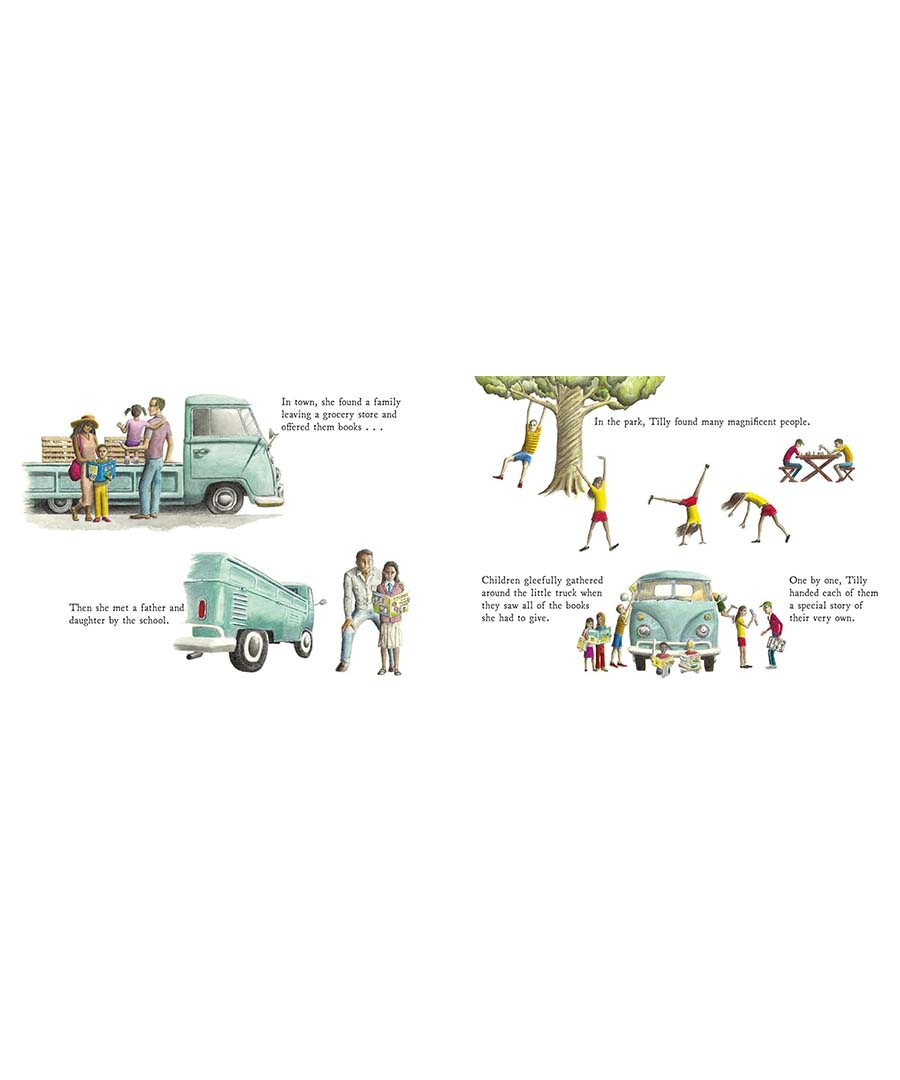 Children gleefully gathered around the little truck when they saw all of the books she had to give. One by one, Tilly handed each of them a special story of their very own.