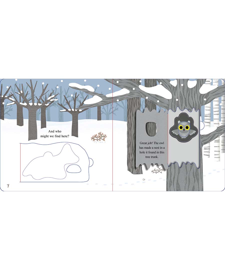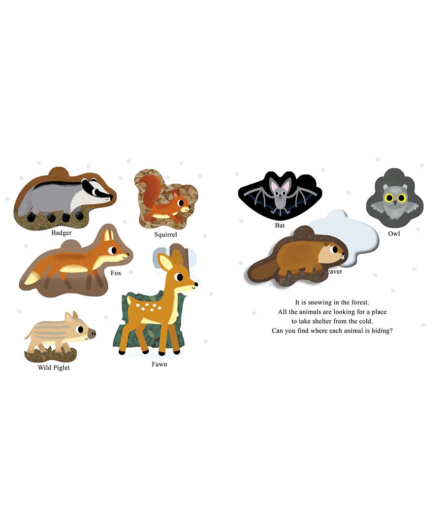 This interactive lift-the-flap board book teaches young readers how animals in the forest search for shelter from the cold. A thick layer of snow has covered the forest. Where will the animals go to get shelter from the cold? Do you know the badger’s secret hideout? Where does the squirrel call home?The lift-the-flaps uncover each forest animal's secret winter hiding spot, with facts about each one, while eight removable animal-shaped pieces encourage young readers to place the animals in those winter nooks, as children develop small motor skills and foster hand-eye coordination.