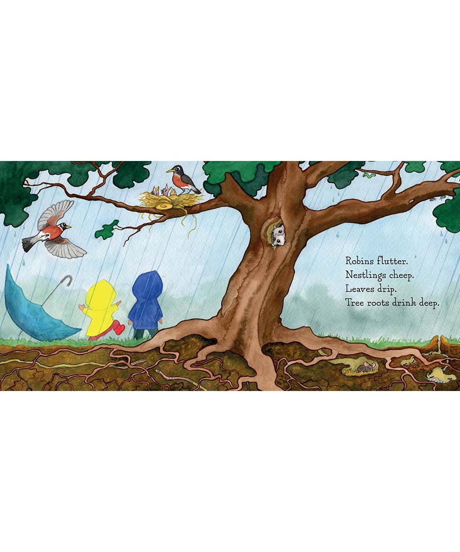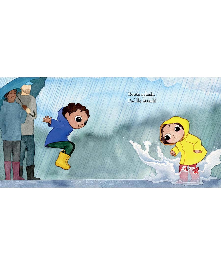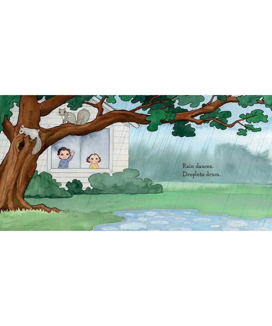 When raindrops begin to fall, a young family pulls on boots and heads outside to play and explore nature. As the clouds grow darker, they return home to wait out the storm where it is safe, warm, and dry. Charming watercolor illustrations and lyrical text celebrate the fun we can have when it rains.