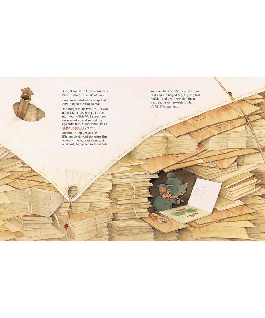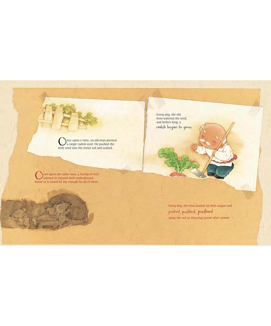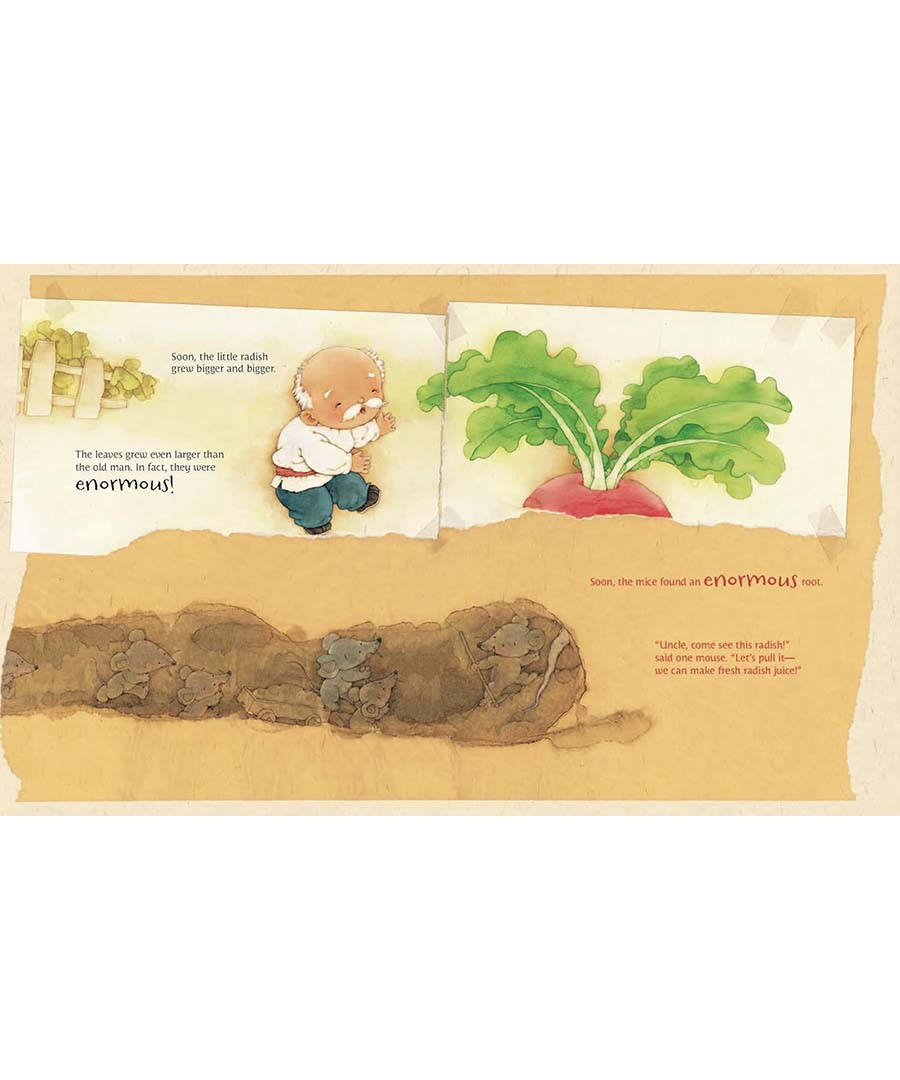 The old man pulls up, up, up, and the mice pull down, down, down. But who will pull the enormous radish from the ground?