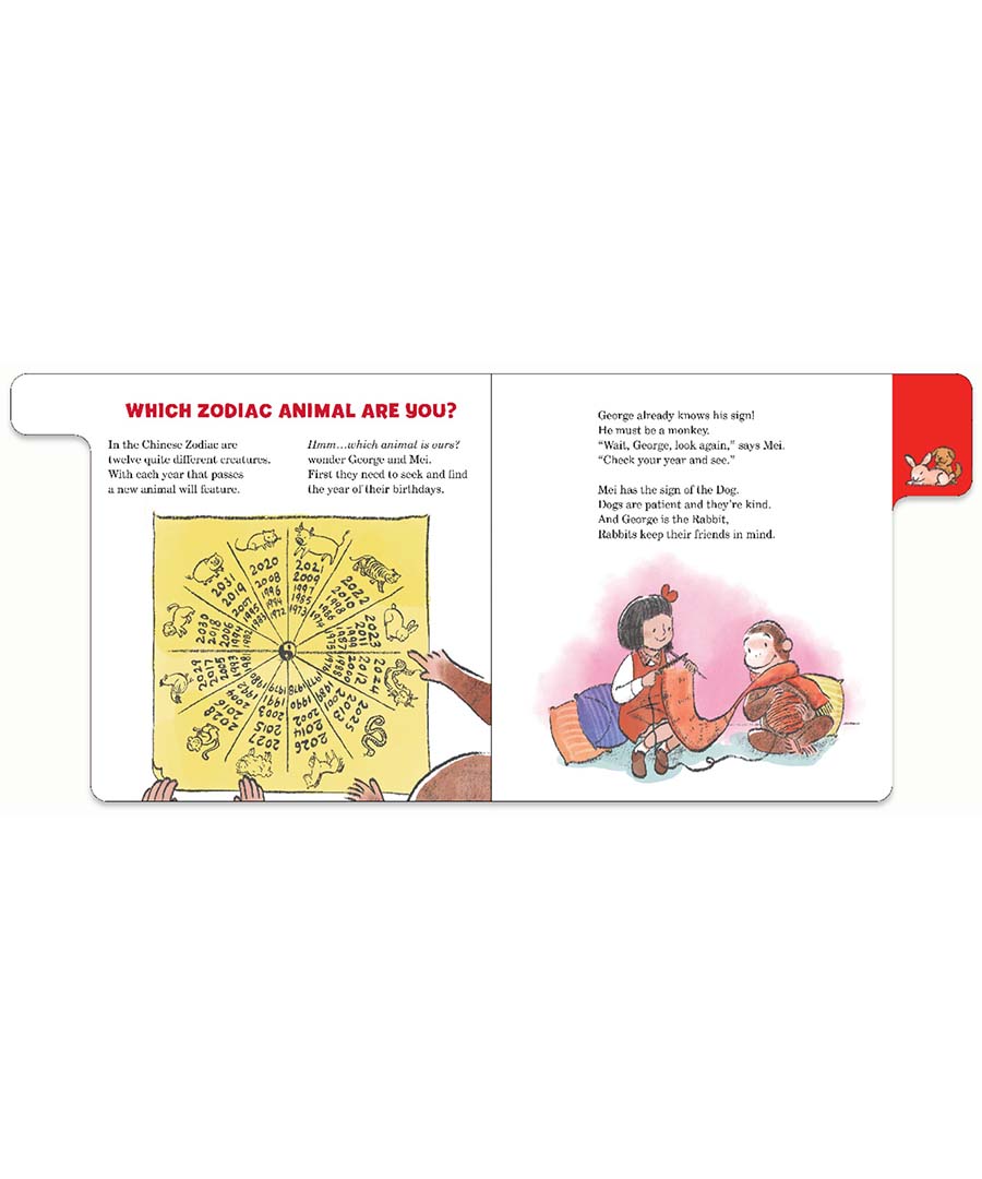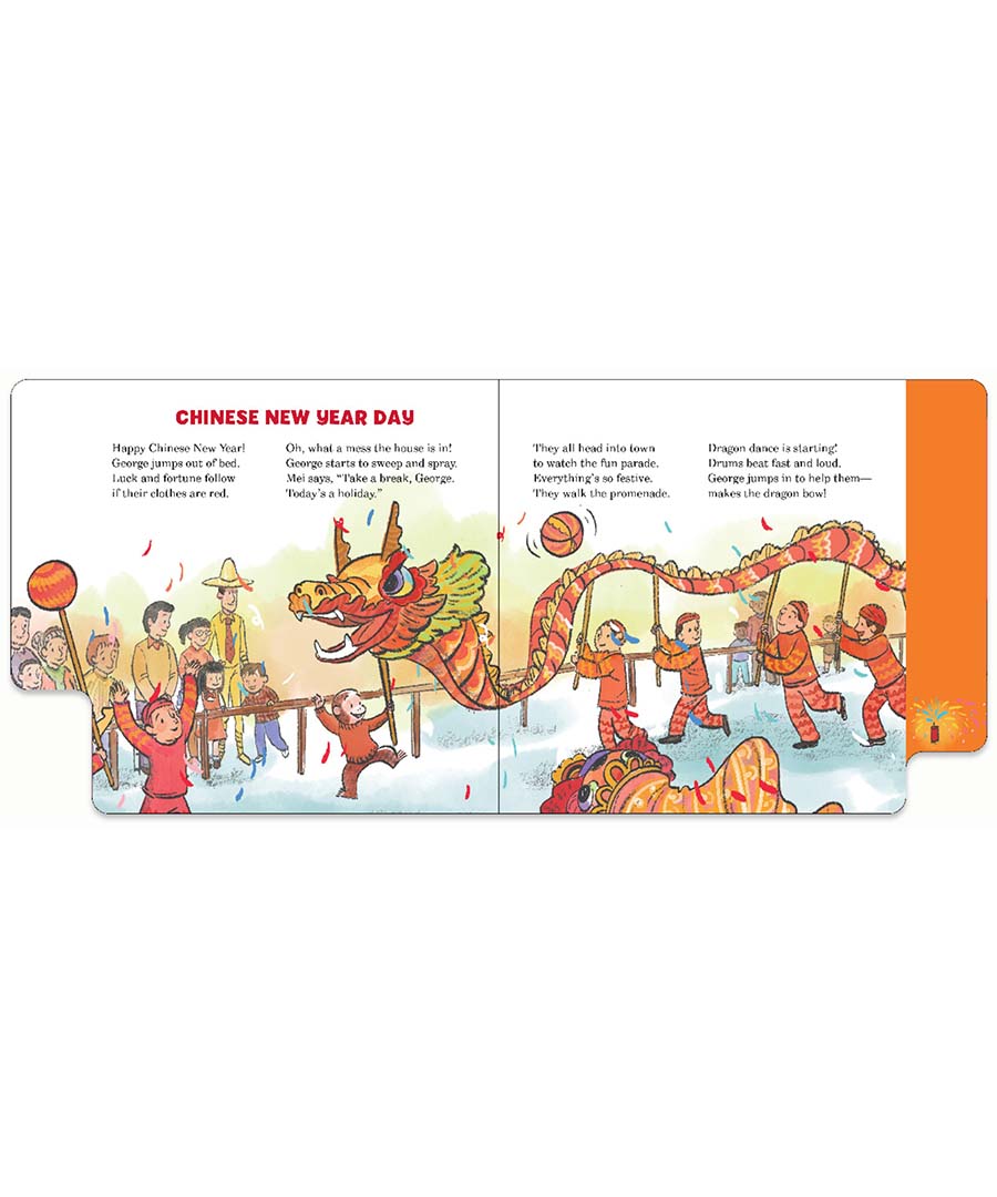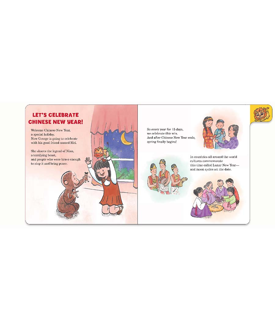 Curious George joins his friend Mei and her family as they prepare for and celebrate Chinese New Year! From cleaning the house and finding red clothes to wear, to hanging decorations and enjoying a family feast, to fireworks and a dragon dance, George and readers will enjoy learning about many Chinese New Year traditions. With a rhyming text, colorful illustrations, and sturdy tabbed pages for the littlest hands, this playful board book makes a great read for all fans of Curious George—those who celebrate Chinese New Year, and those who are learning about it for the first time!