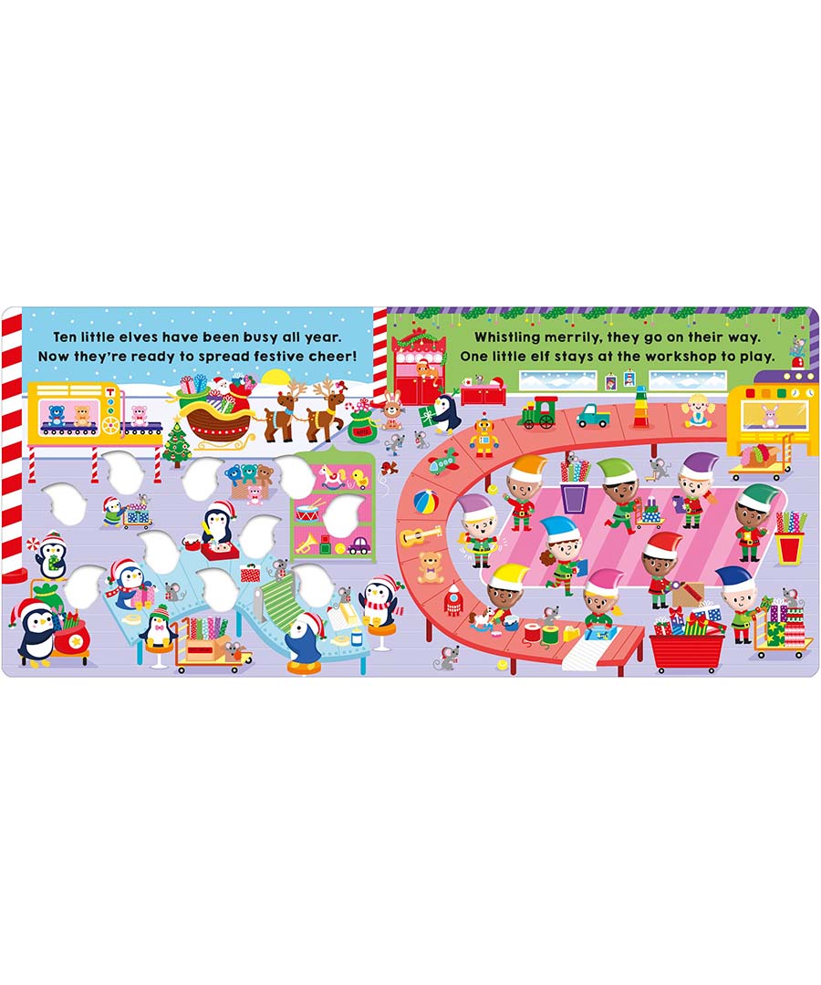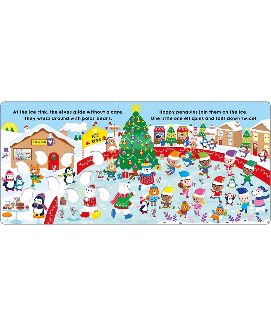 Young children will love joining the merry little elves for lots of festive fun as they ice skate with the penguins, visit the gingerbread people, and much more in this casebound board book that includes squishy silicone characters. On every page there are die-cut shapes for the elves’ faces to appear through so that every time the child turns the page, there is one less character to see.