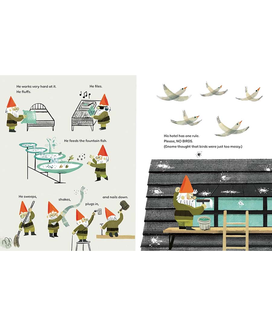 He isn't your garden-variety garden gnome. He runs a small hotel for animals, and he works very hard at it. He spends his days fluffing, filing, and feeding the hotel's fountain fish. And his hard work was finally paying off! His hotel had become a place for small animals to stay for a night or two, and all the guests agreed that there was no place like Gnome's.