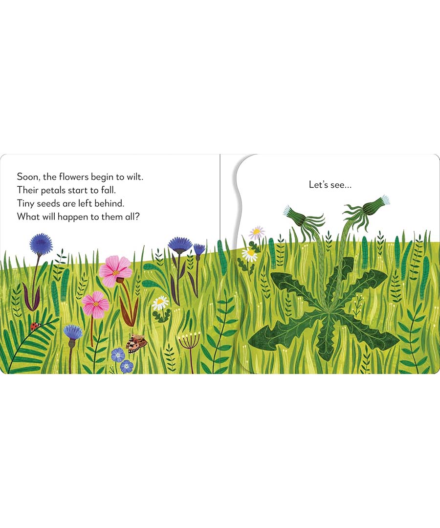 Watch a tiny seed land in the ground and grow into a beautiful flower. Then, watch as the bright yellow petals turn into a fluffy dandelion clock whose seeds get blown away in the breeze ready to be planted again. Look under leaves and peer between petals to discover the plants and creatures hiding there.