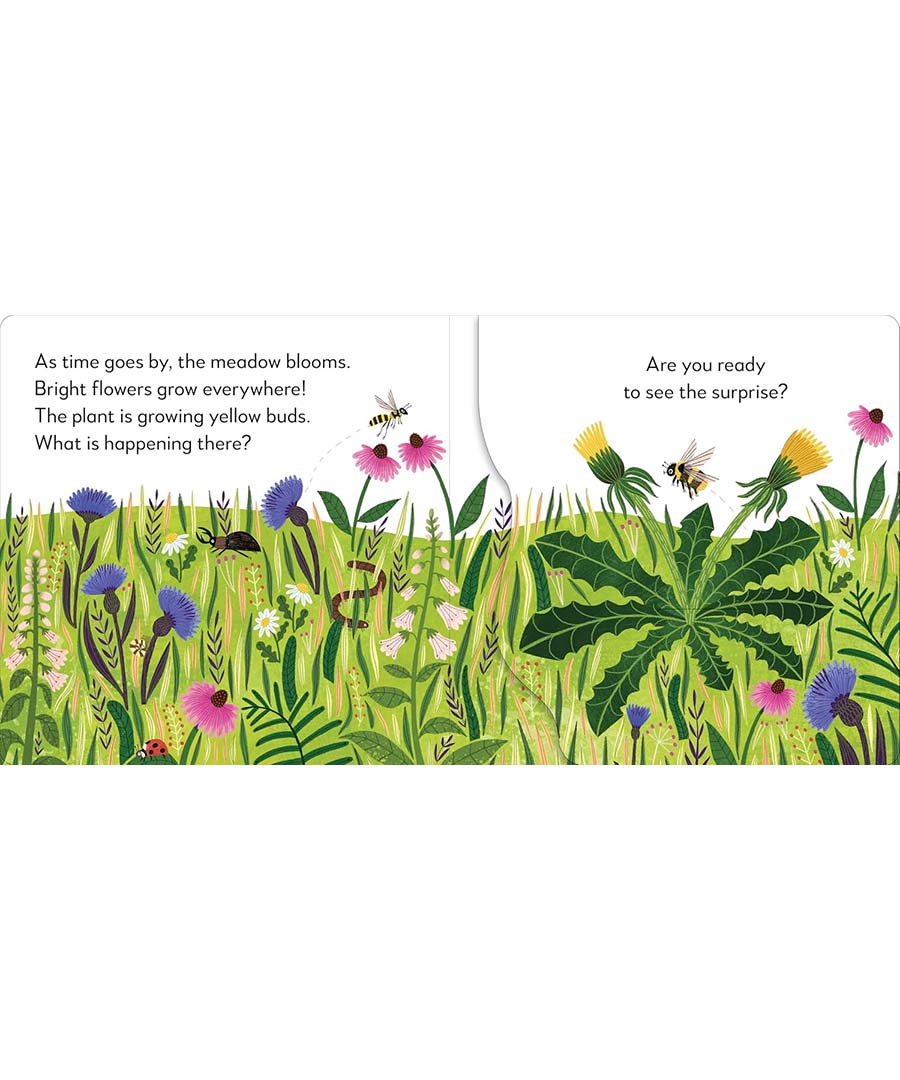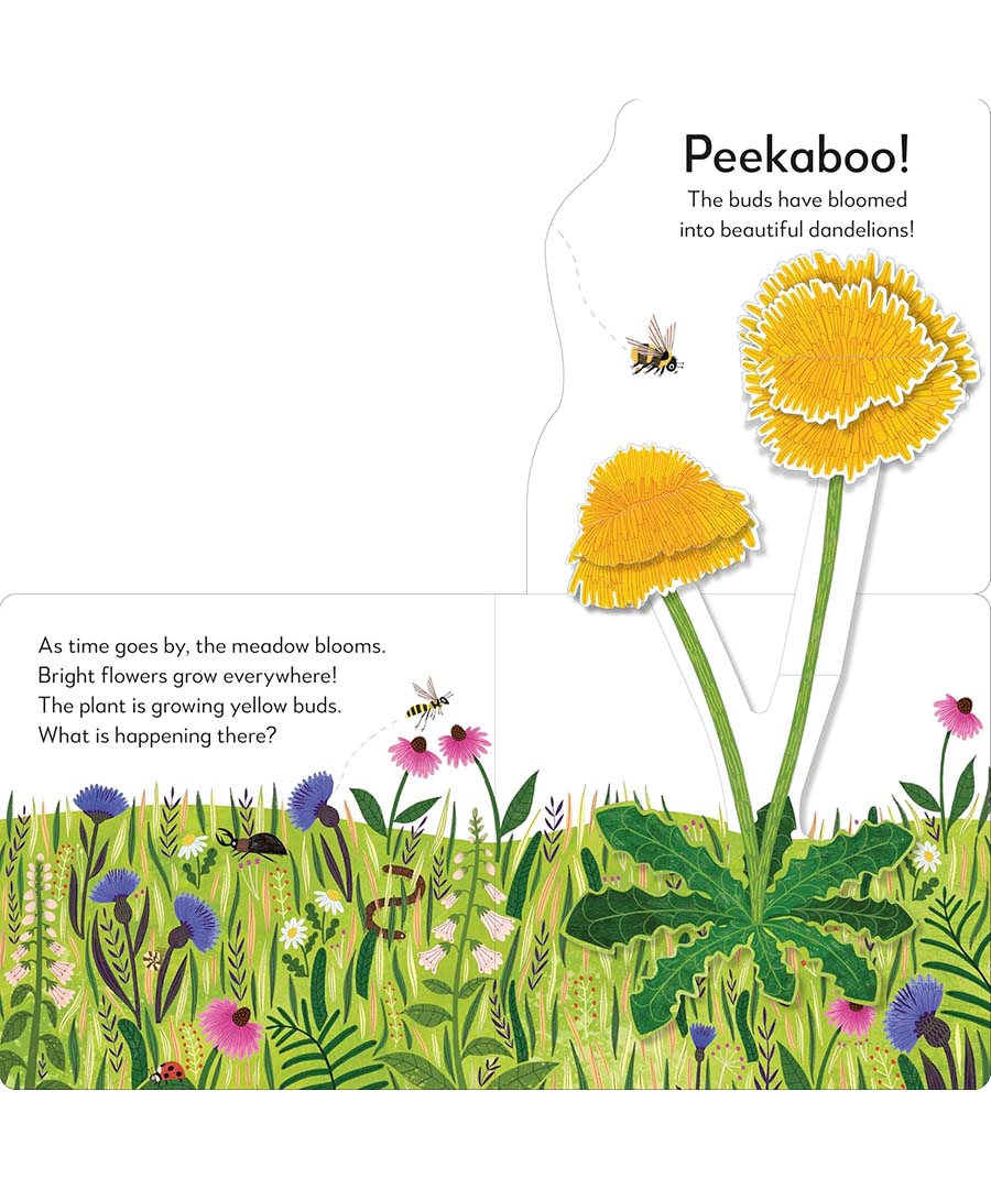Babies and toddlers will love lifting big flaps to find five peekaboo surprises popping up from the pages: worms wriggling under the ground, leaves growing from seeds, bright yellow dandelions bursting into flower, butterflies fluttering from flower to flower, and a dandelion clock blowing away in the breeze.