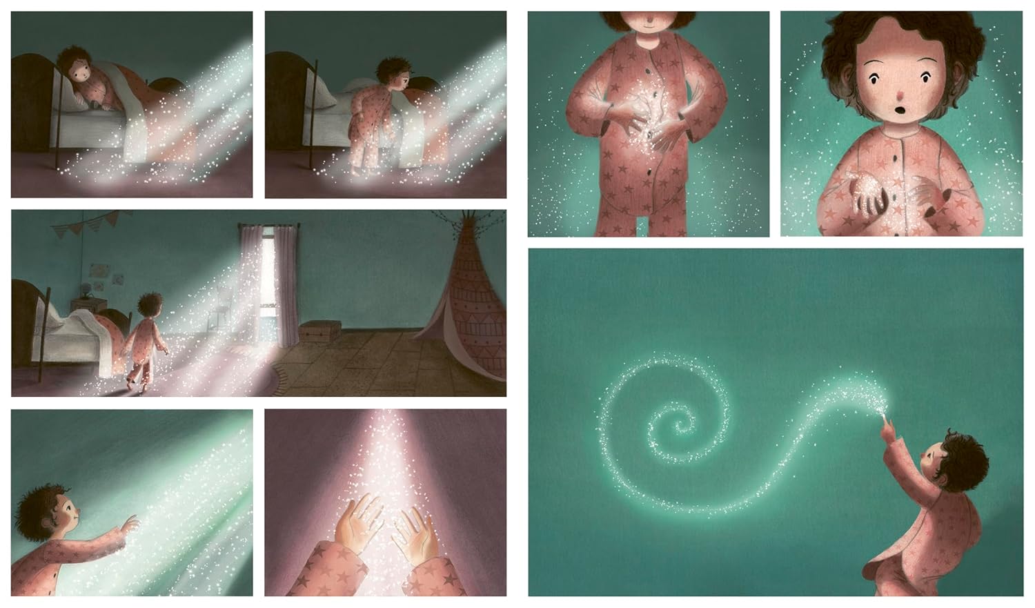 … Until one night, the bright moon shines through a crack in her curtains. Cautiously, Ettie reaches out a hand to touch the light and is surprised to find that it leaves a glittering mark on her hands. Overcome with curiosity and joy, Ettie dances around her room, drawing with this magical beam of moonlight. She pulls open her curtains and begins to connect the stars in the sky as if they were dots. A moon bear slowly appears in the sky, and when she connects the very last dot, he bursts into life, standing in Ettie’s very own bedroom.