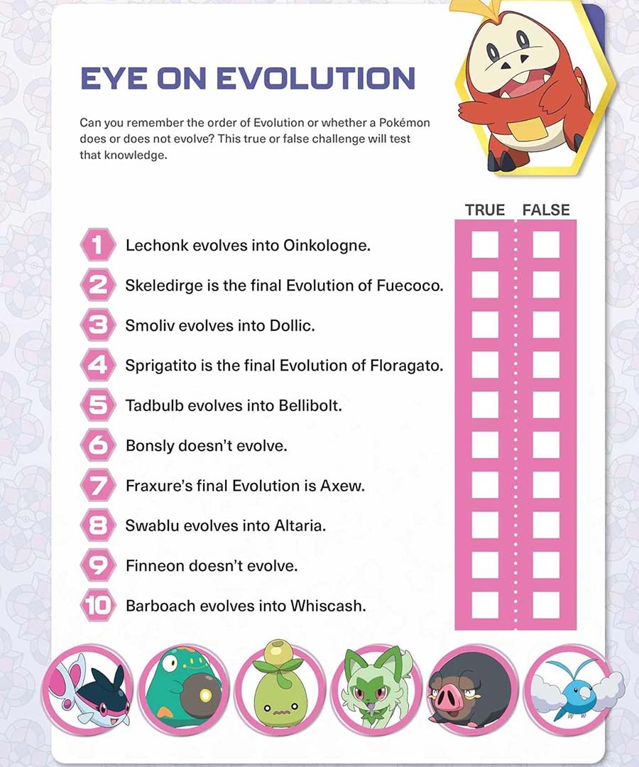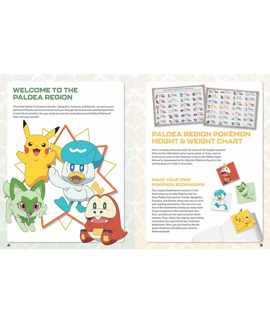 Includes Pokémon Height and Weight Chart for the Paldea Region! This helpful reference chart list select Pokémon found in the activity book by name. Refer to the chart when you're stuck, or if you want to brush up on some of the Pokémon living in the Paldea region that we've discovered so far.