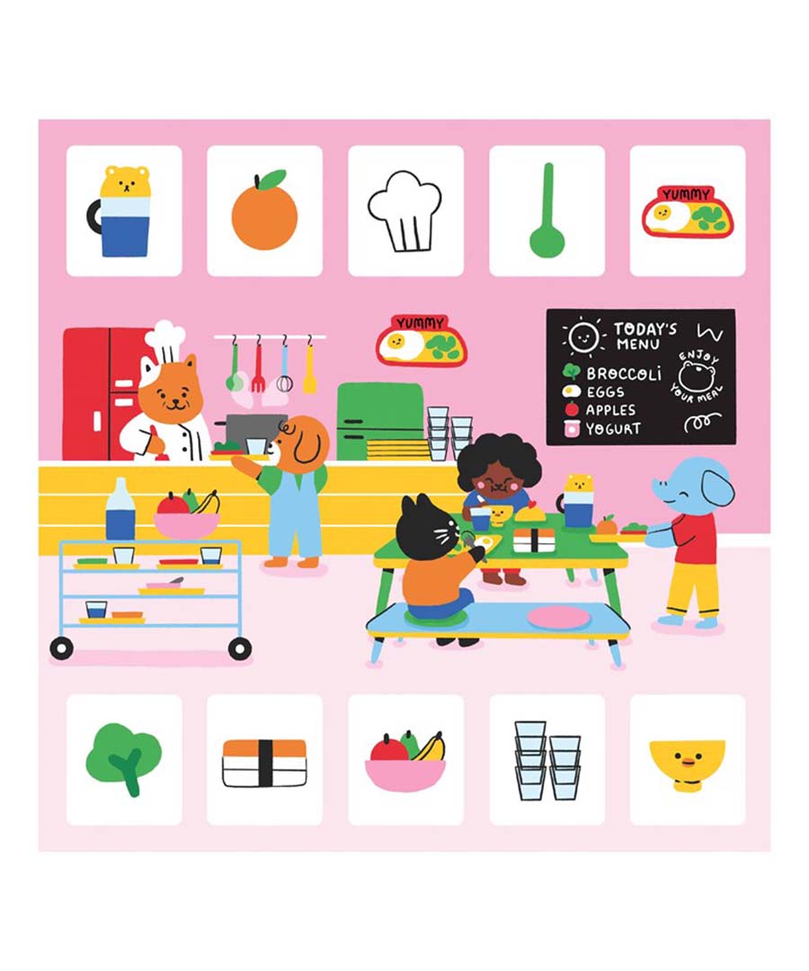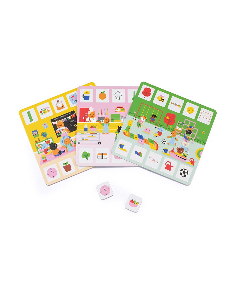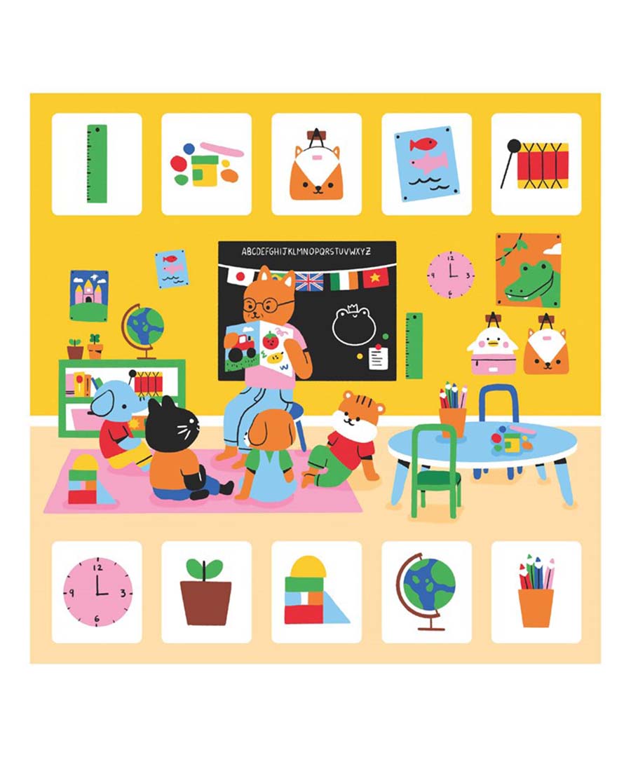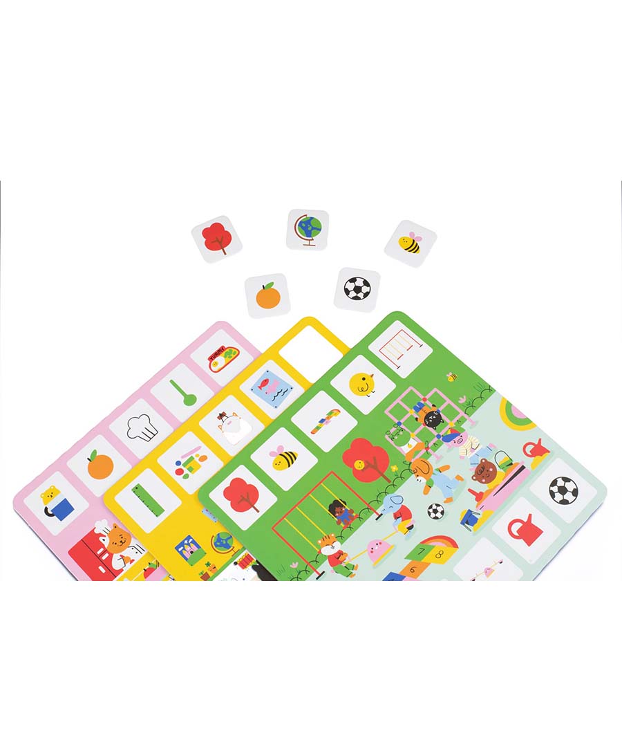 • Contains 4 gameboards with a different illustration on each: the classroom, the library, the dining hall and the playground. Kids will delight in exploring the familiar scenes of daily life – all illustrated with a charming twist