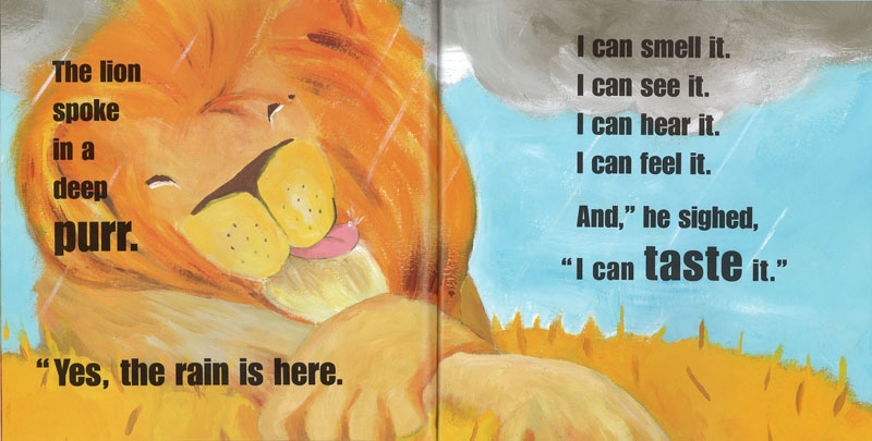 在大雨降臨炎熱的非洲草原前,動物們透過不同的感官似乎已經察覺~豪豬聞到空氣中的雨味、斑馬看到閃電、狒狒聽到雷聲、犀牛感覺到身上的雨滴、獅子品嚐到新鮮的雨水。