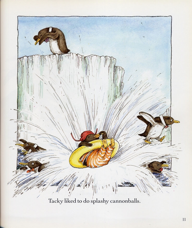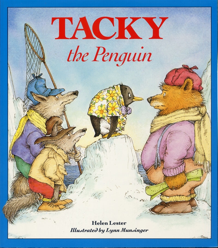 在群體中該隱藏自己的特質以尋求他人的認同嗎? Tacky是隻與眾不同的企鵝,無論他的穿著、打招呼的方式、行進的步伐、跳水的姿勢和歌聲都與其他企鵝朋友們截然不同,儘管如此,他仍樂在其中。直到一天,來了一捕捉企鵝的獵人....,Tacky利用自己的特色,再加上同伴們的認同與合作,終於嚇退可怕的獵人。