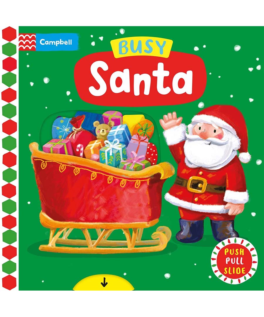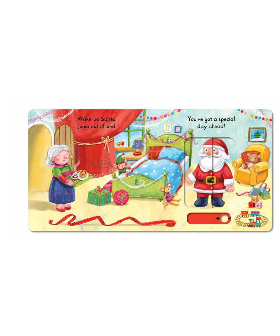 Push, pull and slide the tabs to join Busy Santa on Christmas Eve! Help the elves wrap toys and load up the sleigh, then fly through the sky with Santa Claus and his amazing reindeer to deliver presents to children everywhere.