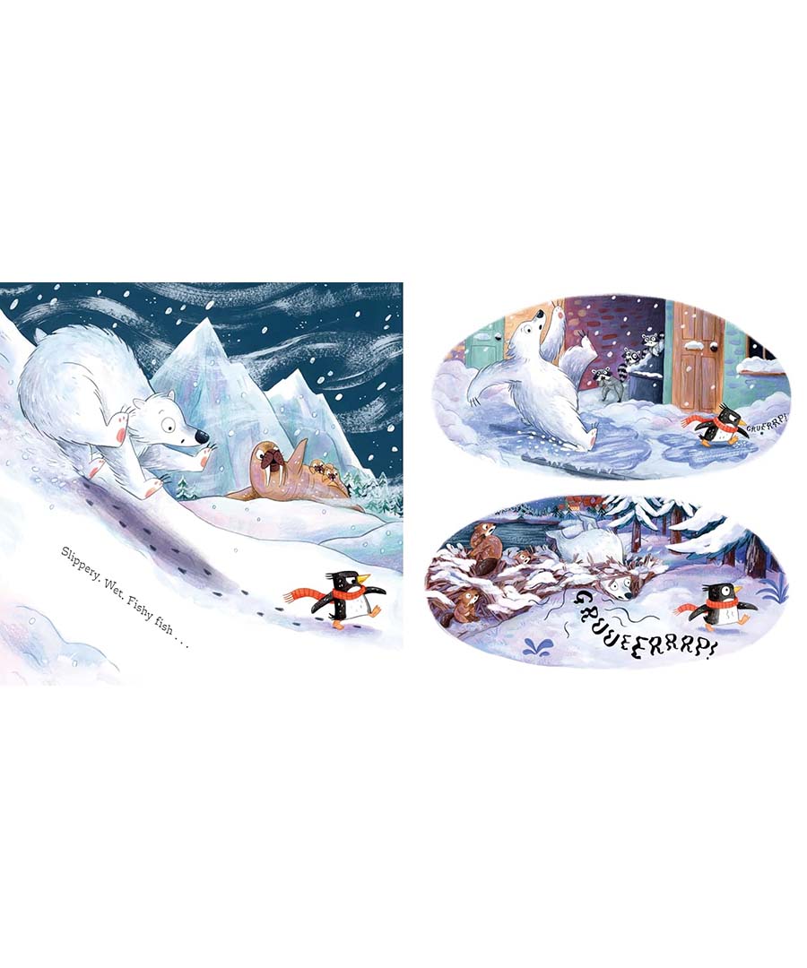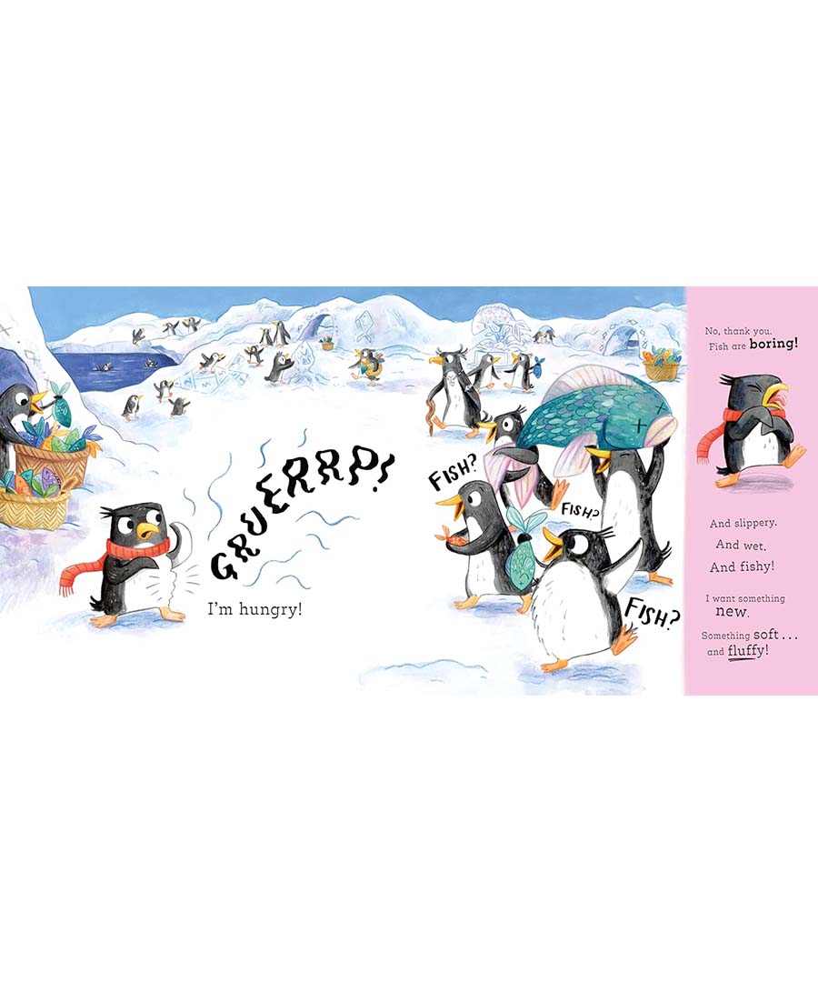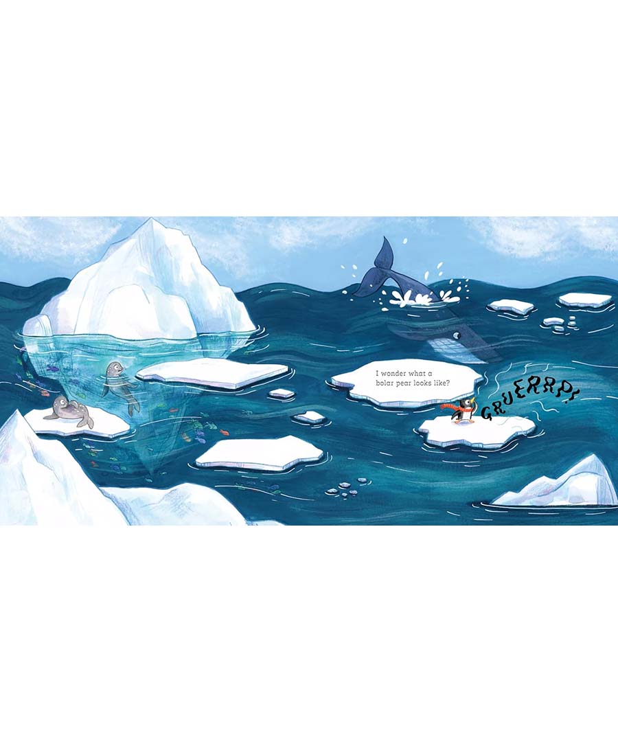 Meet a little penguin who is super hungry but totally bored of eating fish. An older penguin recalls hearing of a fluffy creature called a ‘bolar pear’, so the little penguin sets off on an adventurous mission to find and eat this ‘mystery’ creature.