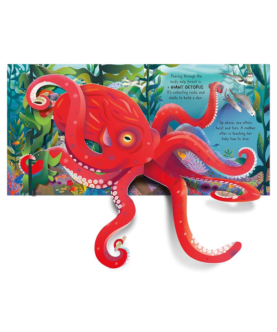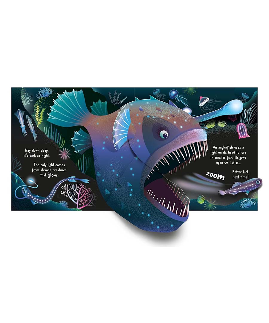Meet a ray and a turtle gliding through a teeming coral reef, spot an octopus hiding in the kelp forest and a shark dashing after a shoal of shimmering sardines. Dare to explore the dark deep where a glowing anglerfish lurks, before meeting a huge blue whale as it rises to the surface. With five fantastic pop ups, this book will take you on an awe-inspiring journey to the depths of the ocean and back again.