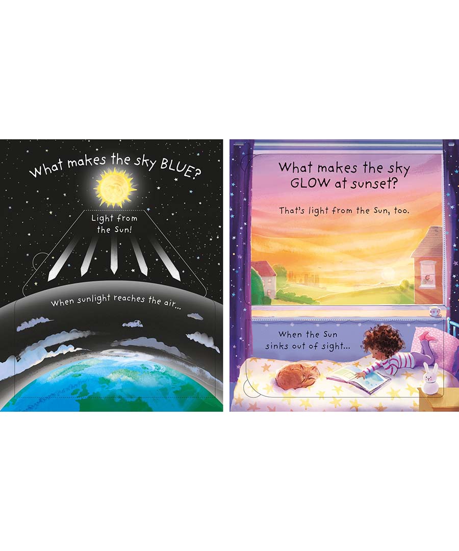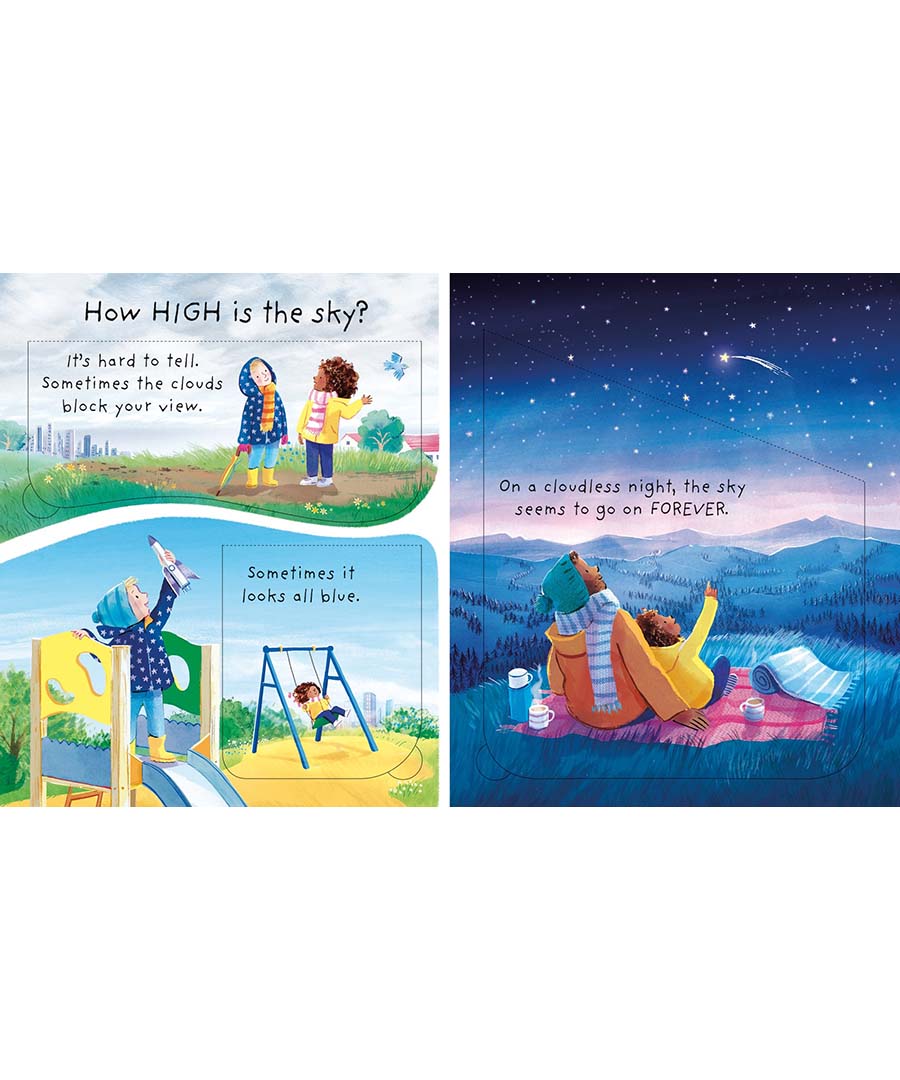 What IS the sky? Where does it end? Is it really blue? And how high can we fly? This charming flap book appeals to young children's natural sense of curiosity and lets them explore the answers for themselves - from cloud watching to star gazing, peachy sunsets to dazzling Northern Lights, helicopter rides to space travel. Discover the highest thing you can see in the sky, the furthest distance a spacecraft has travelled... and what the sky is really made of.