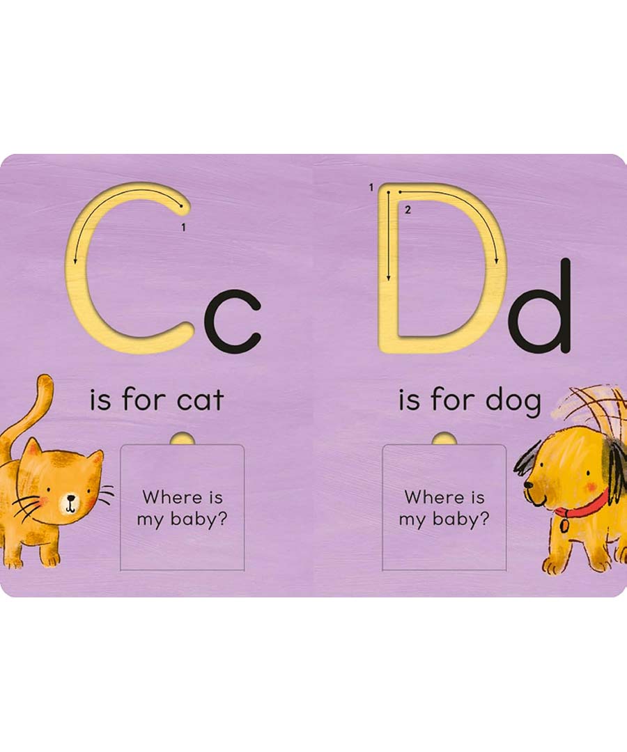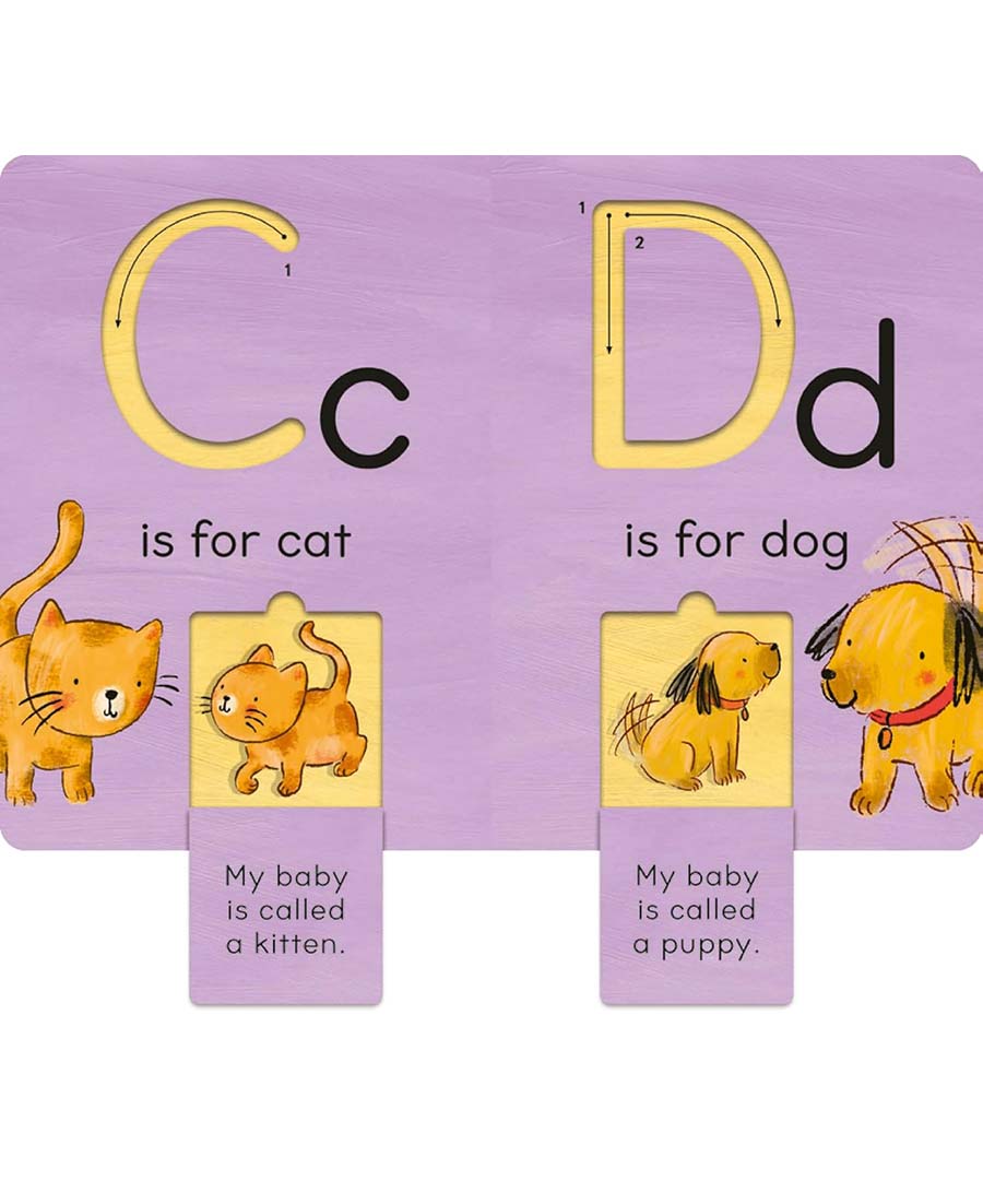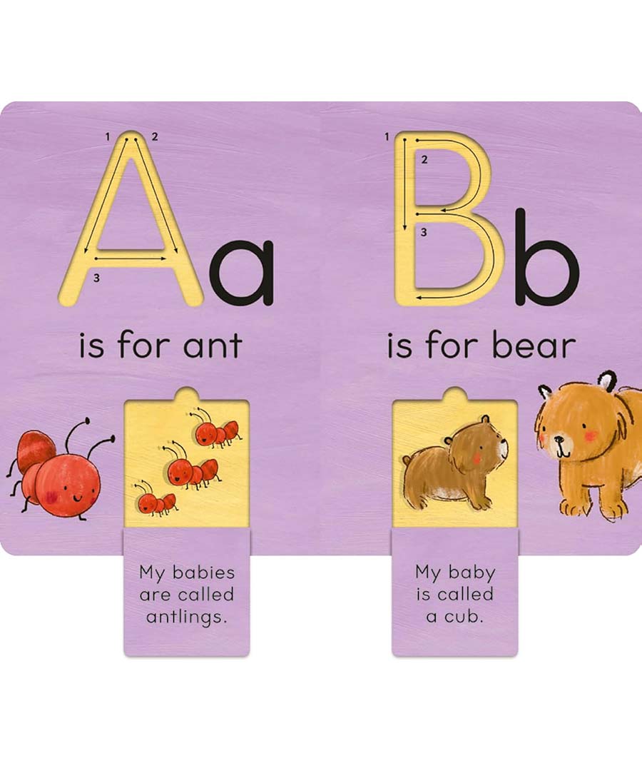 Introduce your child to letters and baby animals with this innovative trace-and-flip book! Using their finger, children can trace each grooved letter to explore its shape, then open the flap on each page to see the baby animal underneath. Readers will learn each letter as they trace the alphabet, as well as practice hand-eye coordination as they open and close the flaps. Caregivers can assist by encouraging children to trace the letter as they sa
