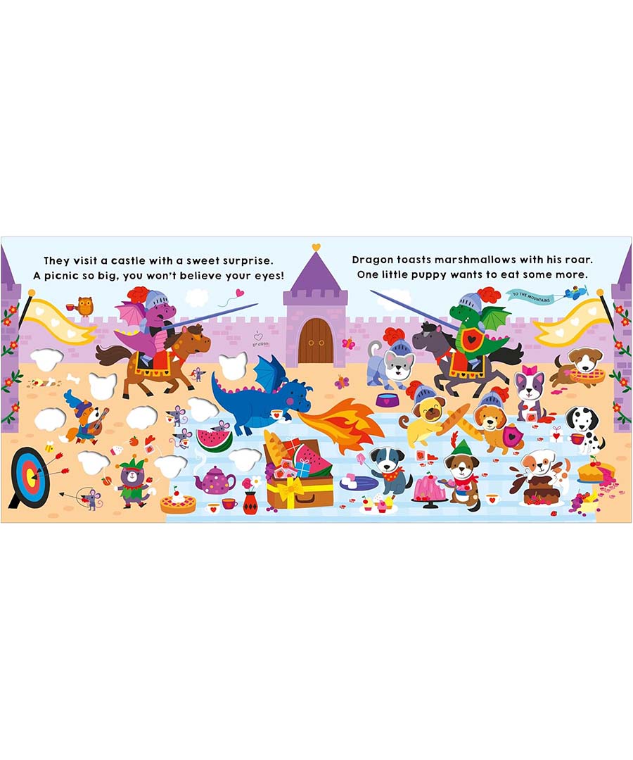 Young children will love joining the kind little puppies for lots of fun as they spread happiness to all their friends, from the friendly dragons to the magical unicorns, and more. Each scene includes soft, squishy characters for children to explore. On every page there are die-cut shapes for the puppies’ faces to appear through so that every time the child turns the page, there is one less character to see.