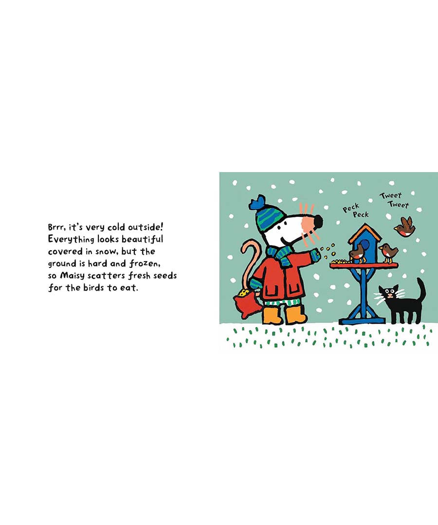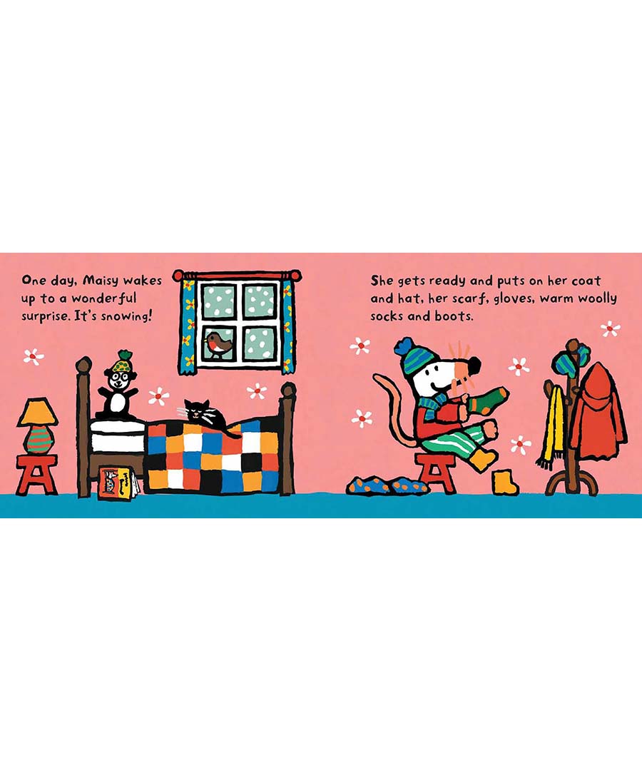 One day Maisy wakes up to a wonderful surprise: it’s snowing! After putting on her coat, scarf, and gloves, she heads outdoors, where everything looks beautiful covered in snow. In the park, Eddie and Cyril are catching snowflakes, while Charley and Tallulah throw snowballs. Maisy joins in the fun, building a snowman and sledding down a hill. Yippee! When it gets too cold, the whole crew returns inside for hot cocoa and a snuggle. Warm and inviting, this quintessential winter story captures the joys of a snowy day spent with friends.