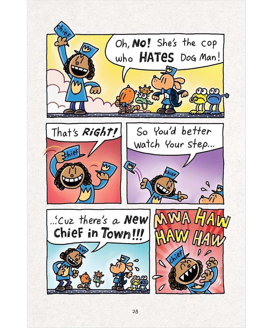 P.U.! Dog Man got sprayed by a skunk! After being dunked in tomato juice, the stink is gone but the scarlet red color remains. Now exiled, this spunky superhero must struggle to save the citizens who shunned him! Will the ends justify the means for Petey, who's reluctantly pulled back into a life of crime in order to help Dog Man? And who will step forward when an all-new, never-before-seen villain unleashes an army of A.I. robots?