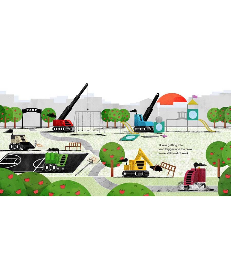 After a long day’s work, Digger and the other big trucks are ready to tuck themselves into bed. They wash, they brush, and they sing a goodnight song. But before they can fall asleep, two mischievous raccoons appear. And they are not tired—at all.