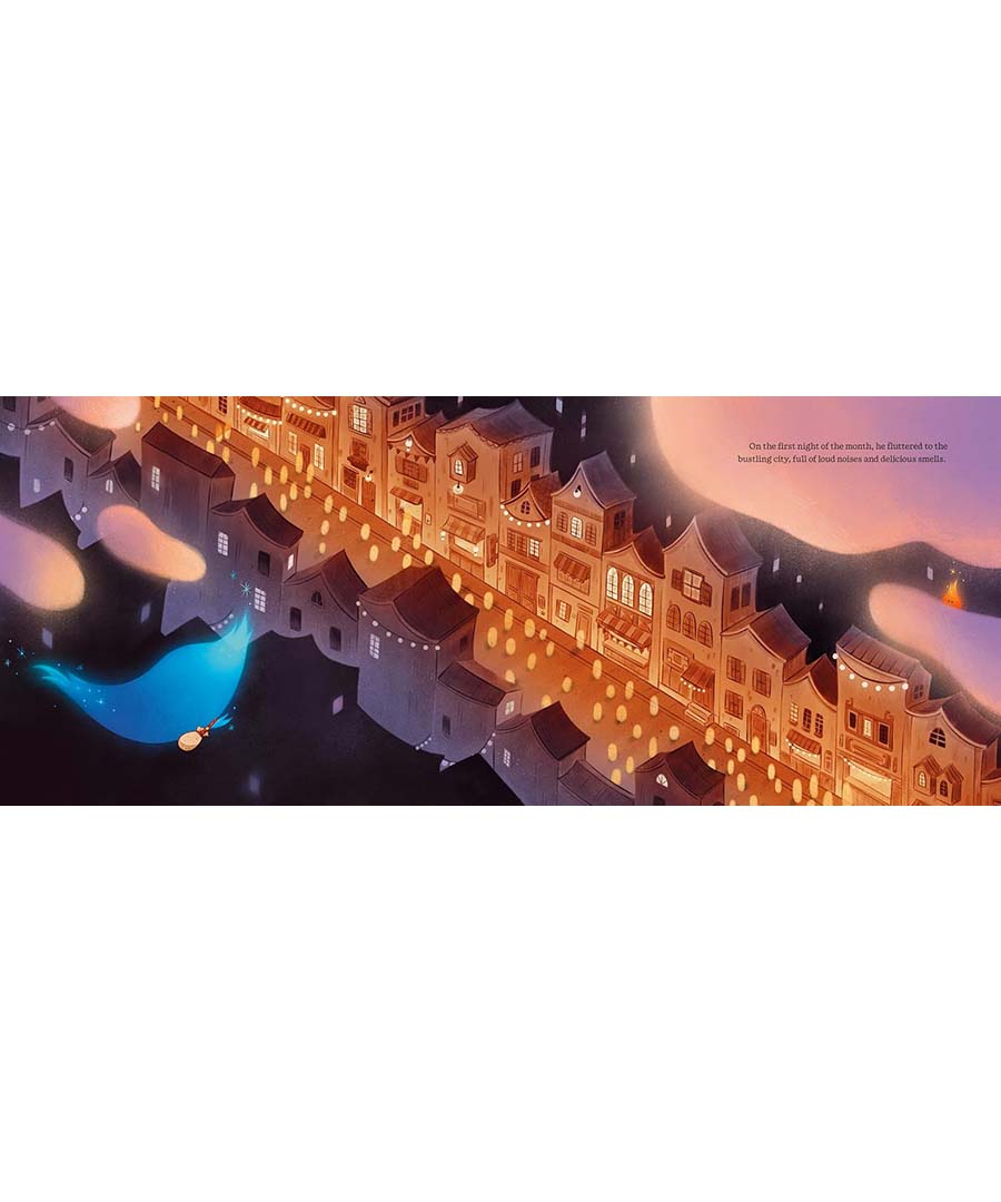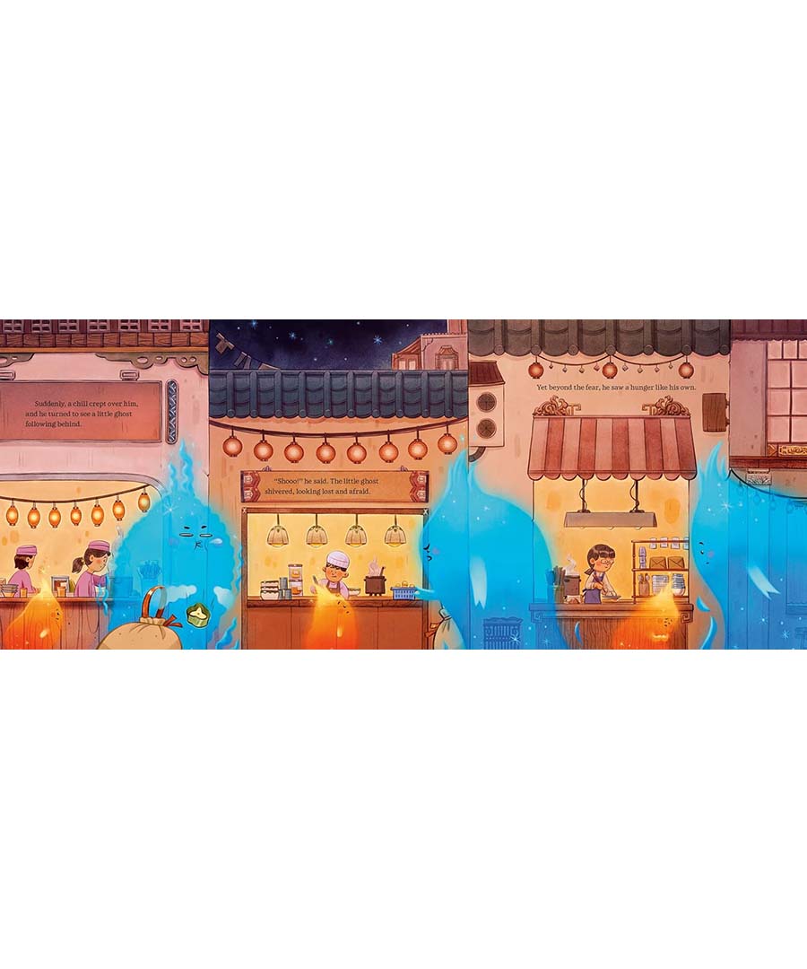 Yet no matter how much Gwei eats, his hunger won’t go away. As he searches for the perfect meal, he catches someone following him. It's another hungry little ghost! When he hears her grumbling belly, he reluctantly reaches into his pouch to share. To his surprise, he finally starts to feel full.