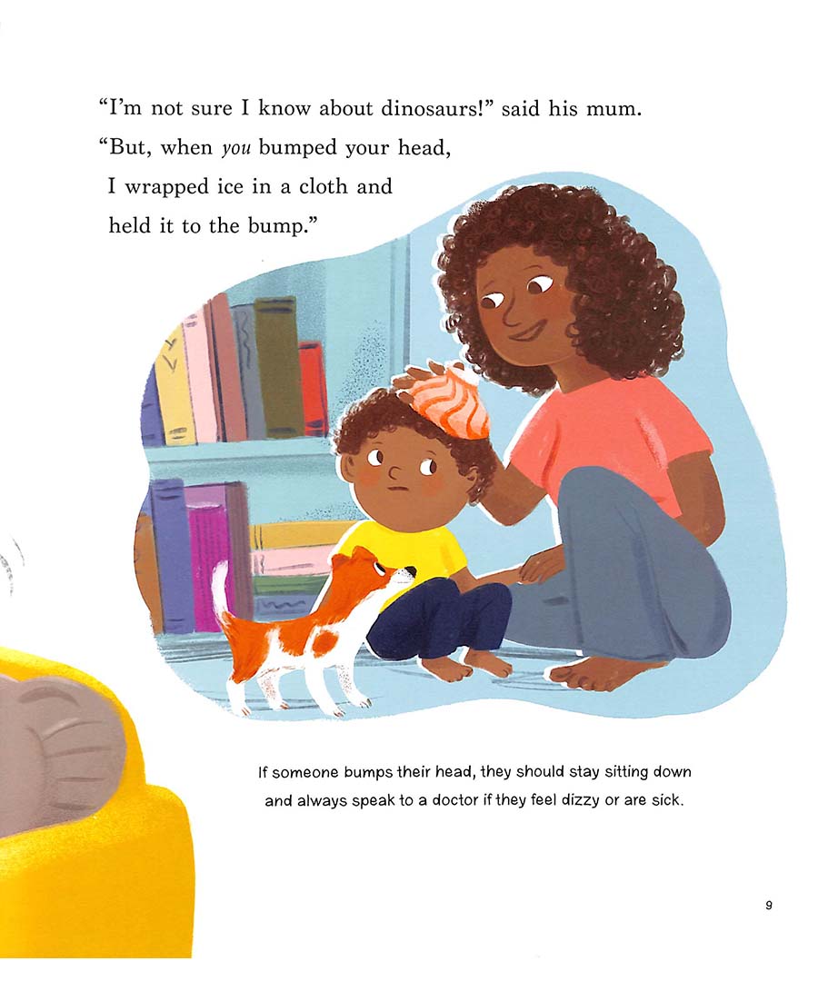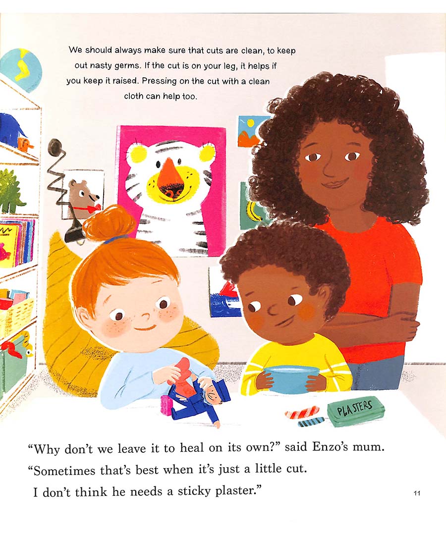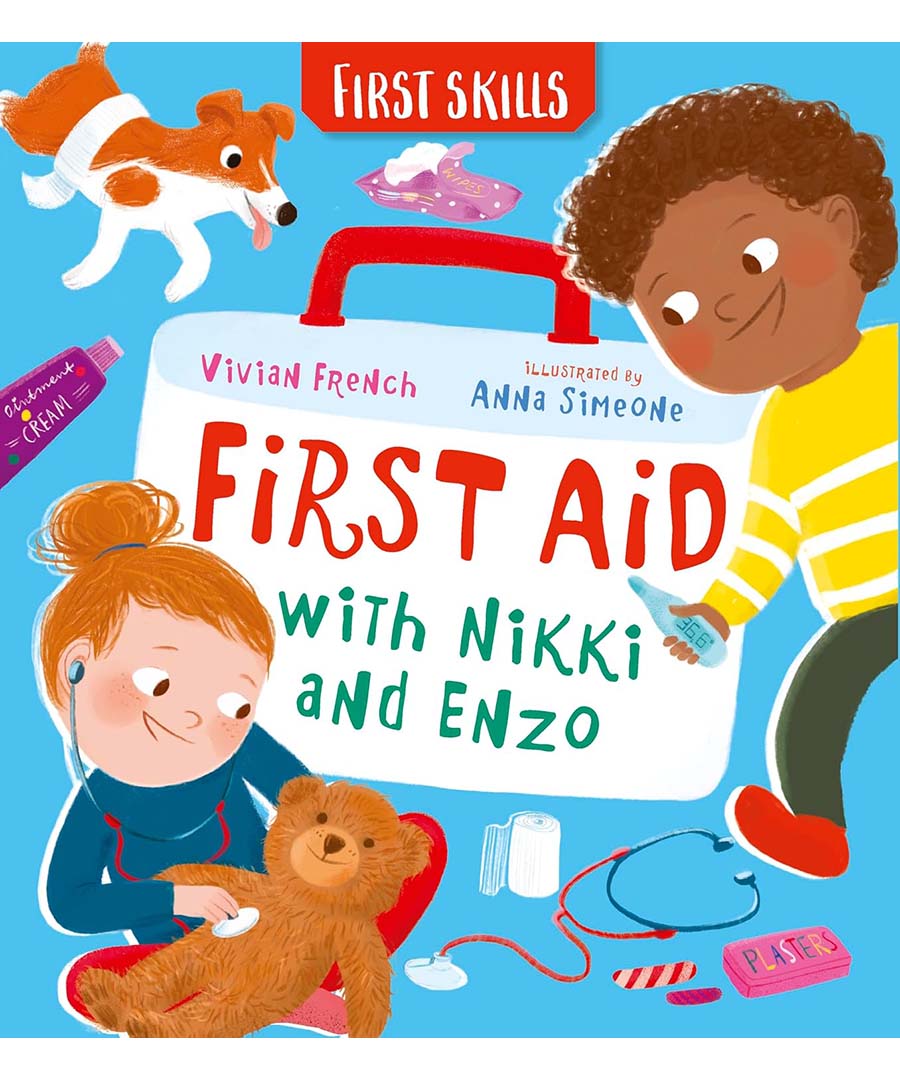 A charming story all about First Aid, perfect for very young children. Nikki and Enzo are playing accidents … LOTS of accidents. When Nikki’s dinosaur bumps his head, Enzo’s mum, who works as a doctor, introduces them to the very basics of first aid. With words by master storyteller Vivian French, and delightful pictures by Anna Simeone this whimsical story is sure to be brilliantly useful to parents and teachers alike.