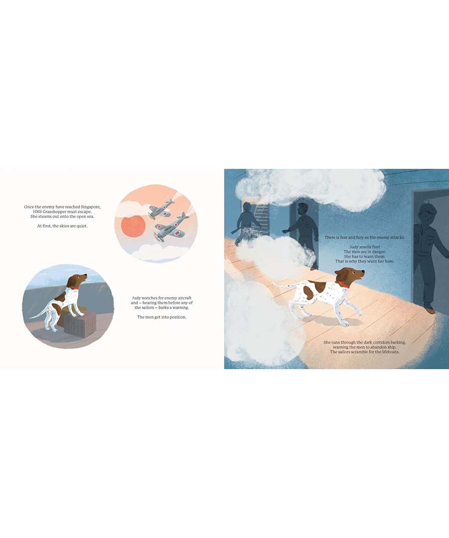 Judy是一隻住在軍艦「蚱蜢號」上的狗,也是船員們最重要的夥伴。她抓老鼠、守望海面,時時提醒危險,更在戰火紛飛的日子裡,用陪伴帶給士兵溫暖與安心。Judy深深愛著船上的每一個人,尤其是她最親近的Frank。直到戰爭改變了一切,士兵們被俘、她與Frank失散,孤單與恐懼向她襲來。但她並沒有放棄,她鼓起勇氣,憑著對人的愛與忠誠繼續前行。這是一個關於勇敢、希望與陪伴的動人故事,訴說動物如何在最黑暗的時刻,成為人類心中最亮的光。