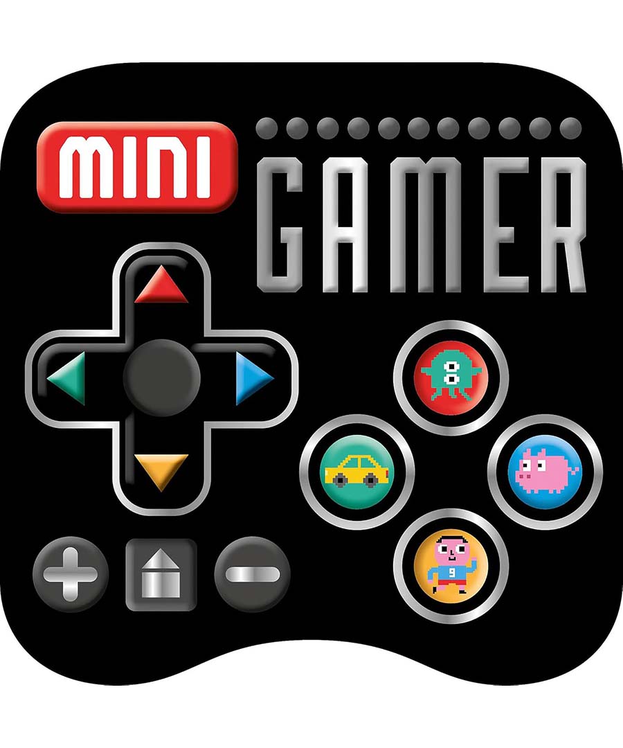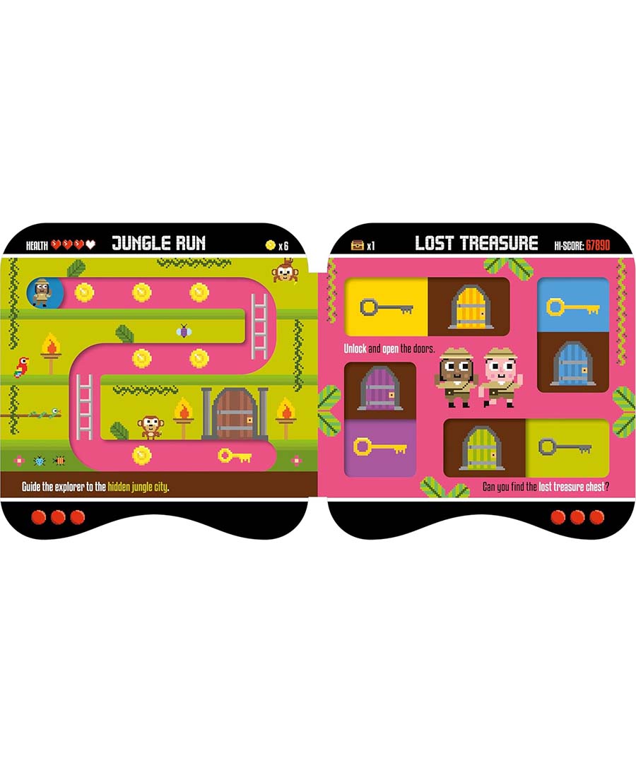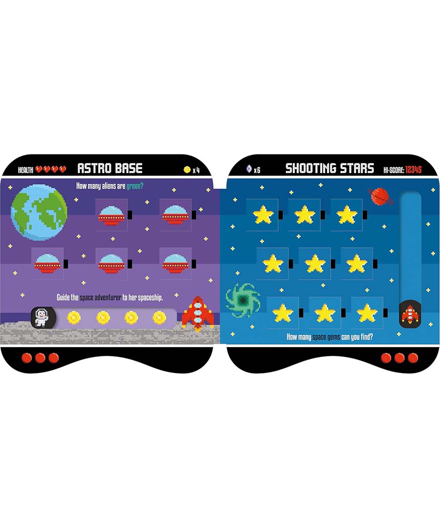 Get ready for some arcade fun in the interactive board book, Mini Gamer. Each page offers a play experience with trails, flaps, spinners, and sliders, which replicate retro-style video games. This fun new title has a hard, molded EVA cover that looks like a console controller and cool pixel-style artwork.